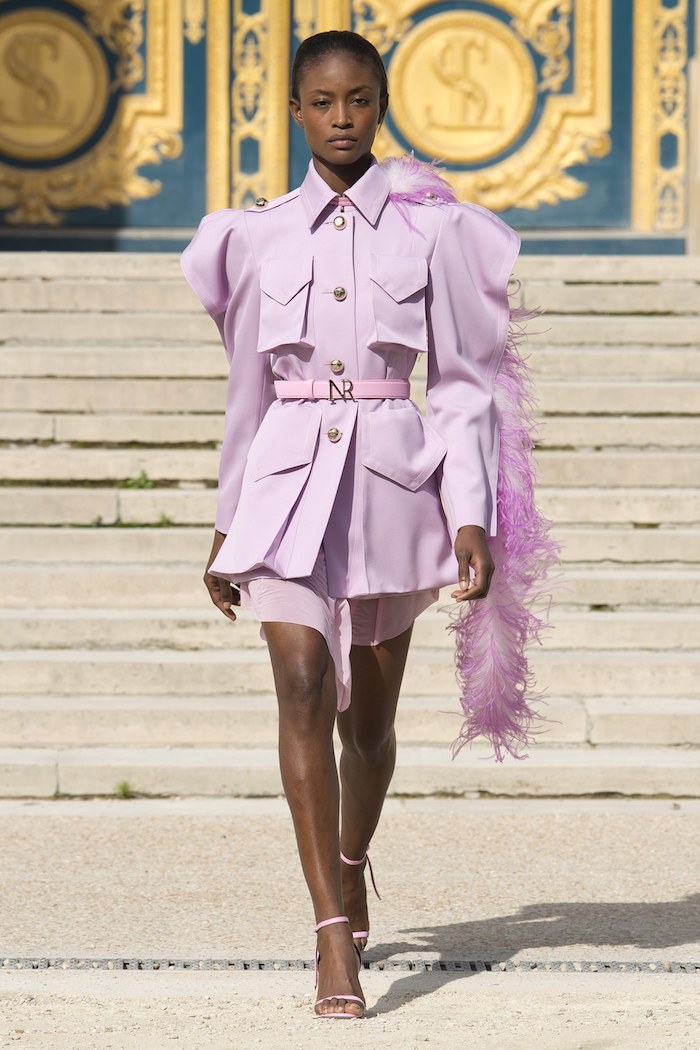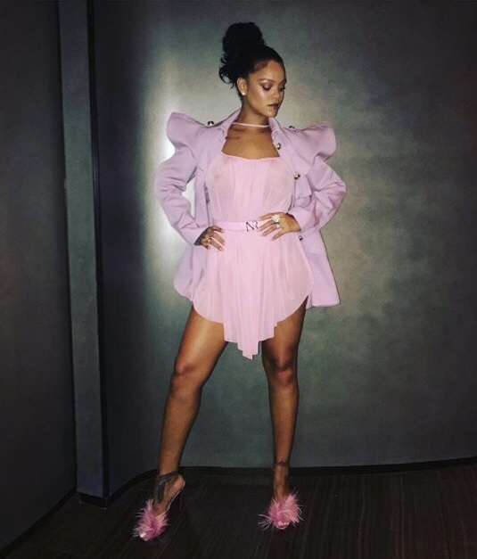 Wearing fab designer looks fresh off the runway is a surely a way of life for Rihanna. To wit, the Bajan beauty took to Instagram laced in a Nina Ricci Spring 2018 Pink Leather Gold Logo Belt, a Brass-Buttoned Big Bellows Pockets Exaggerated Shoulders Jacket and a Sheer Detail Dress: