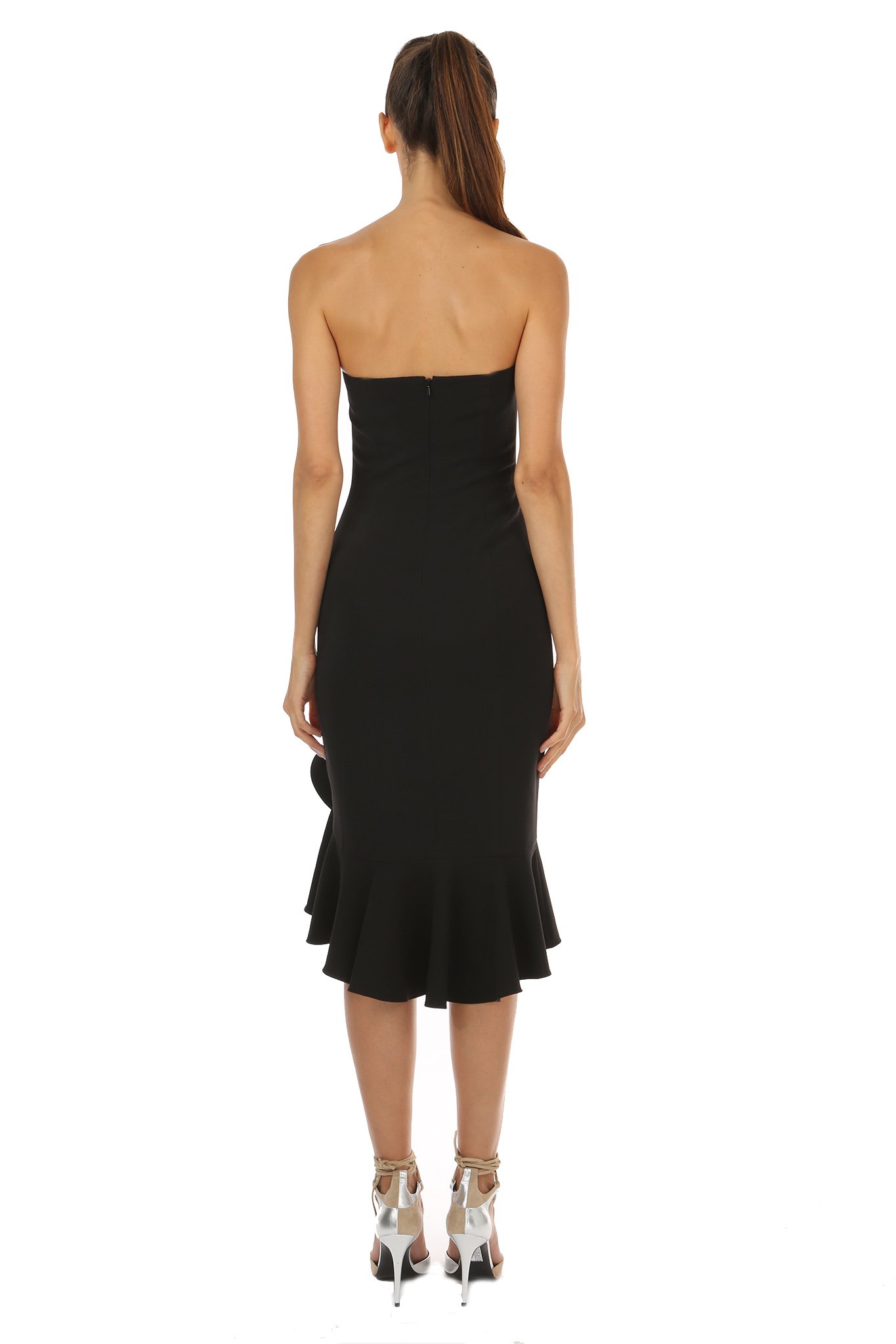 This stunner boasts an ultra feminine ruffling at the skirt hem with an asymmetrical detailing that shows off a bit of leg.