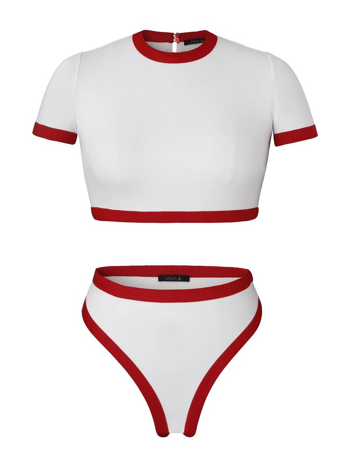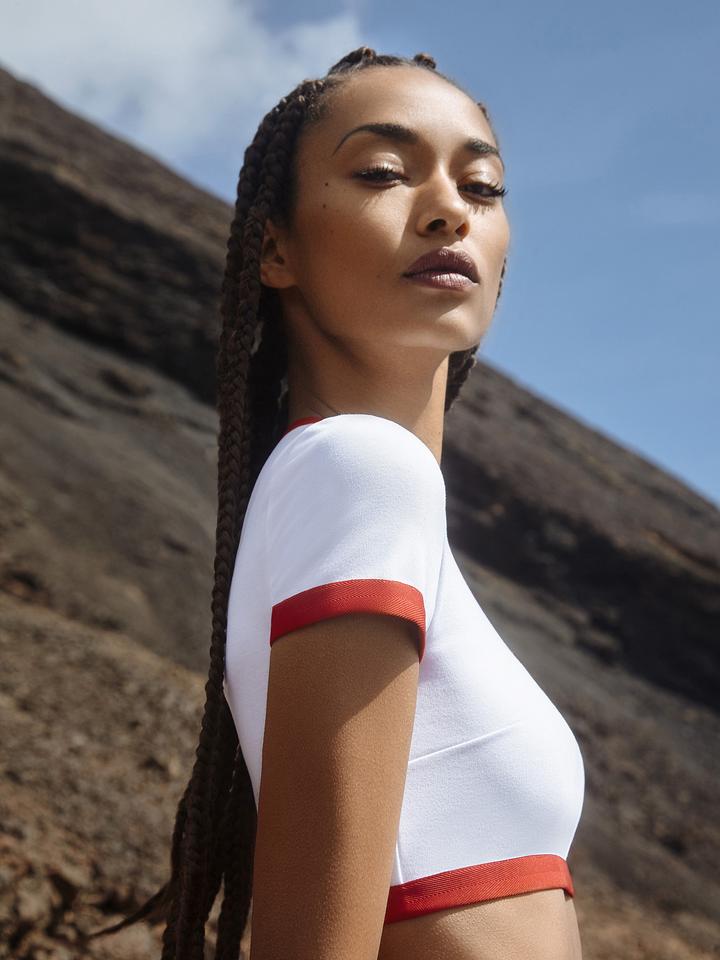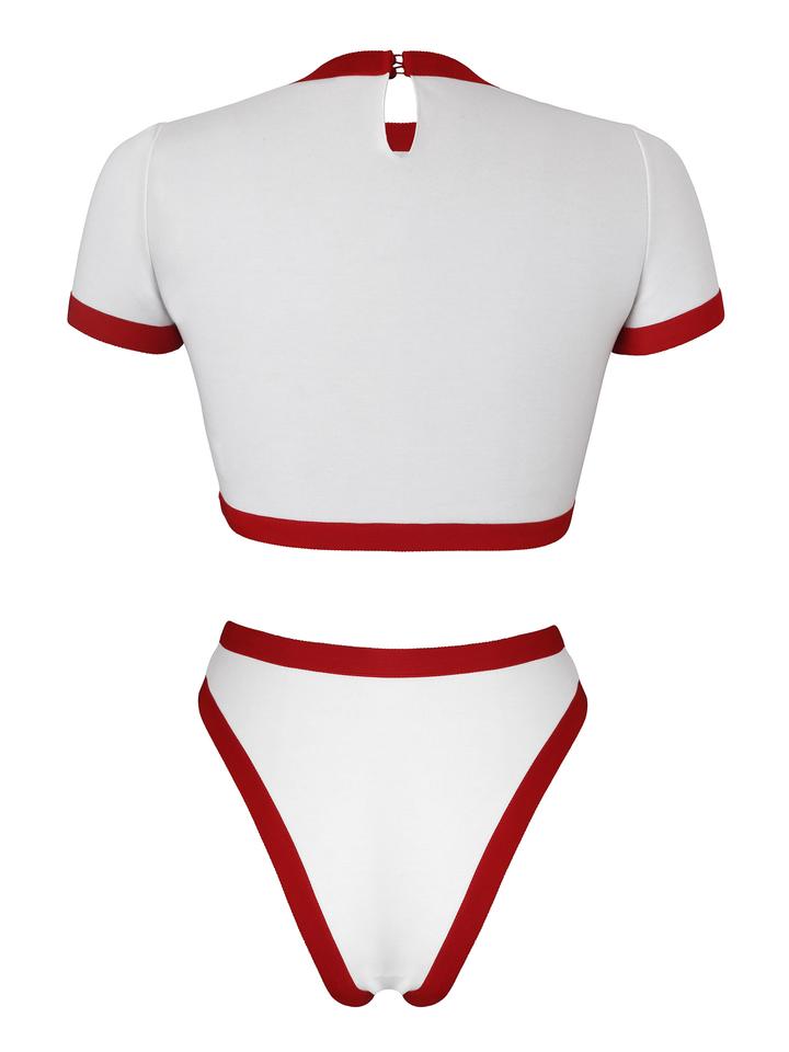 The Italian made two piece short sleeve bodysuit features a high-waisted 90’s inspired shape.