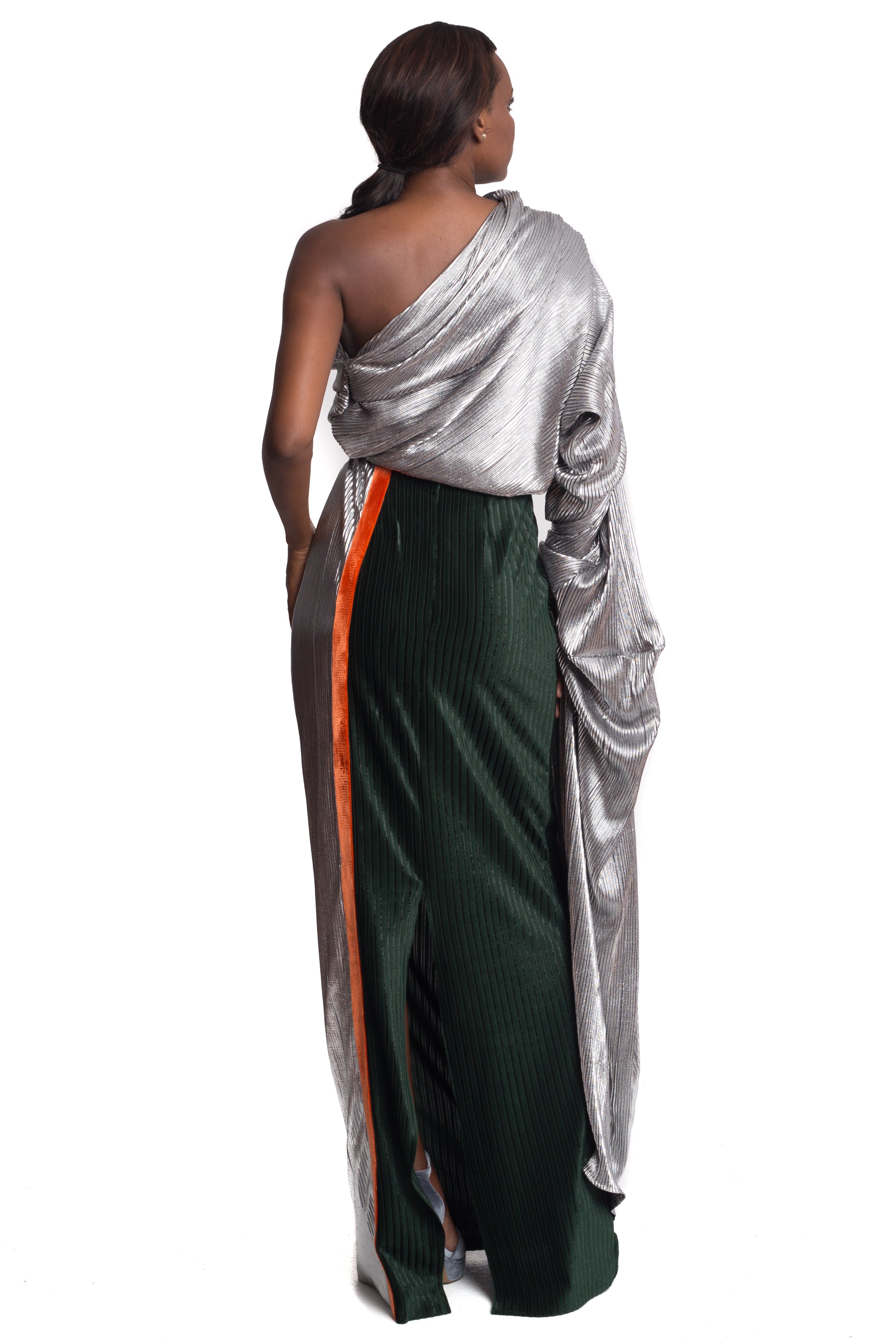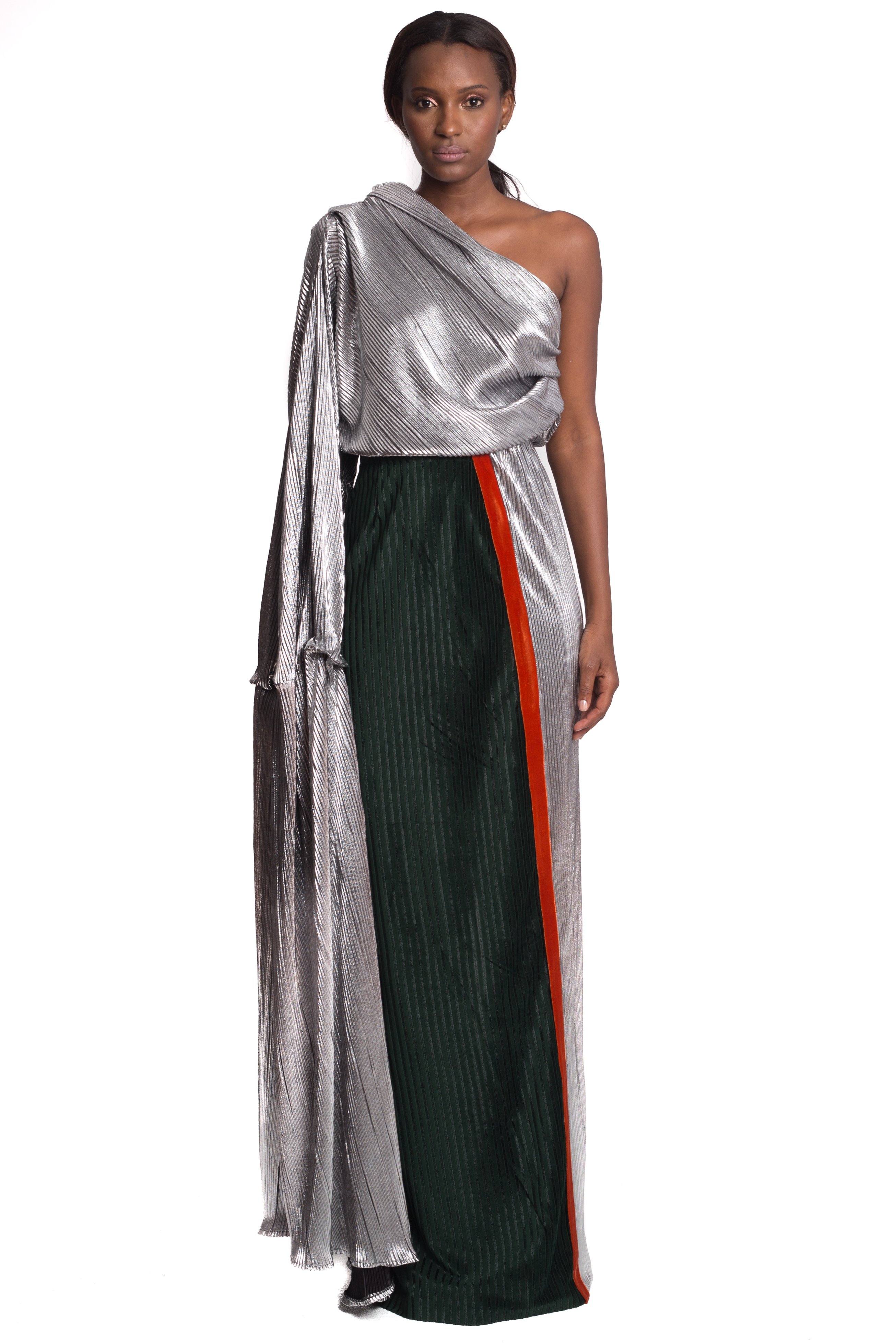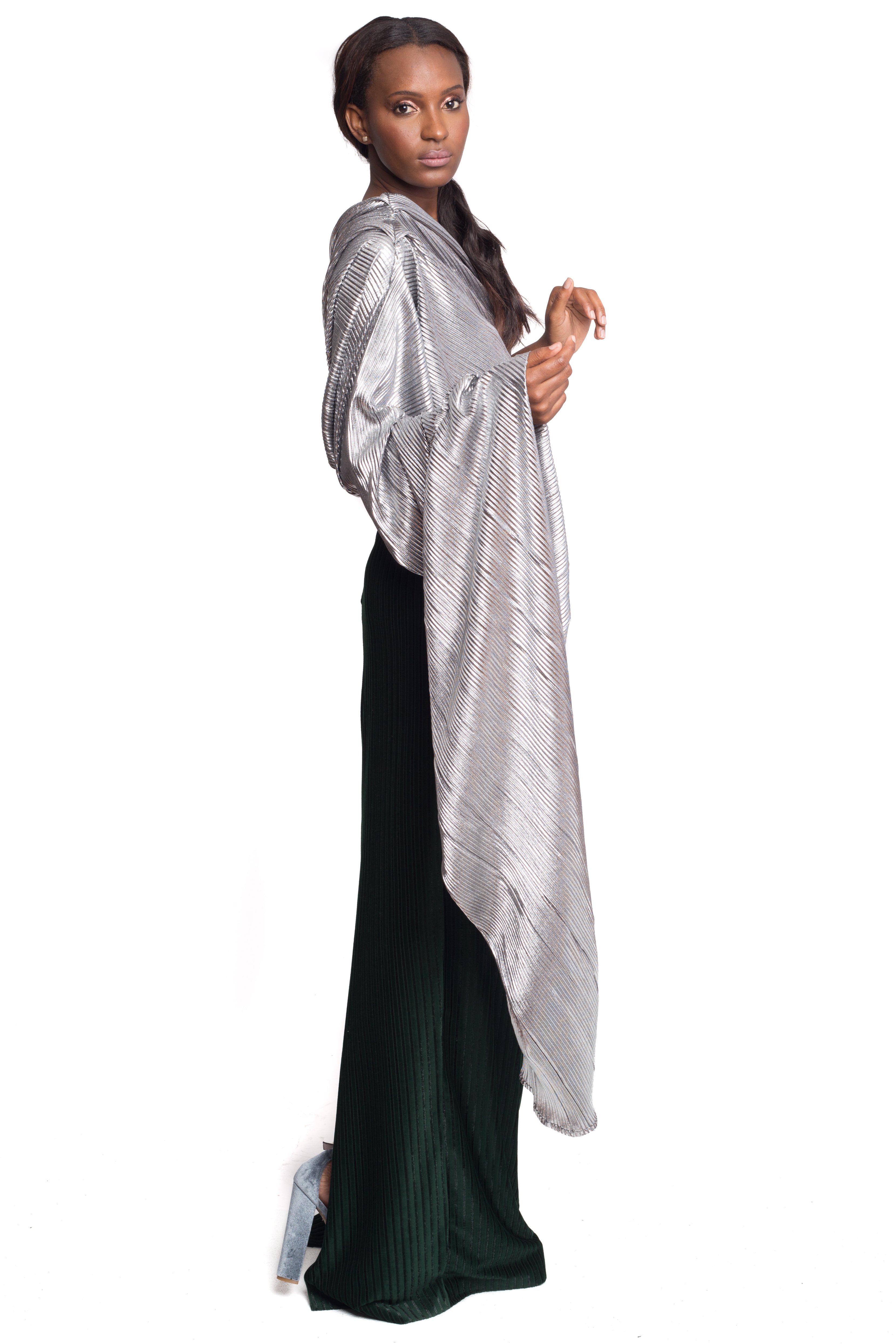 Inspired by the Studio 54 scene this shimmering piece is made from the finest silver lame fabric, a single shoulder neckline that leads to fierce exaggerated sleeve. Hot!