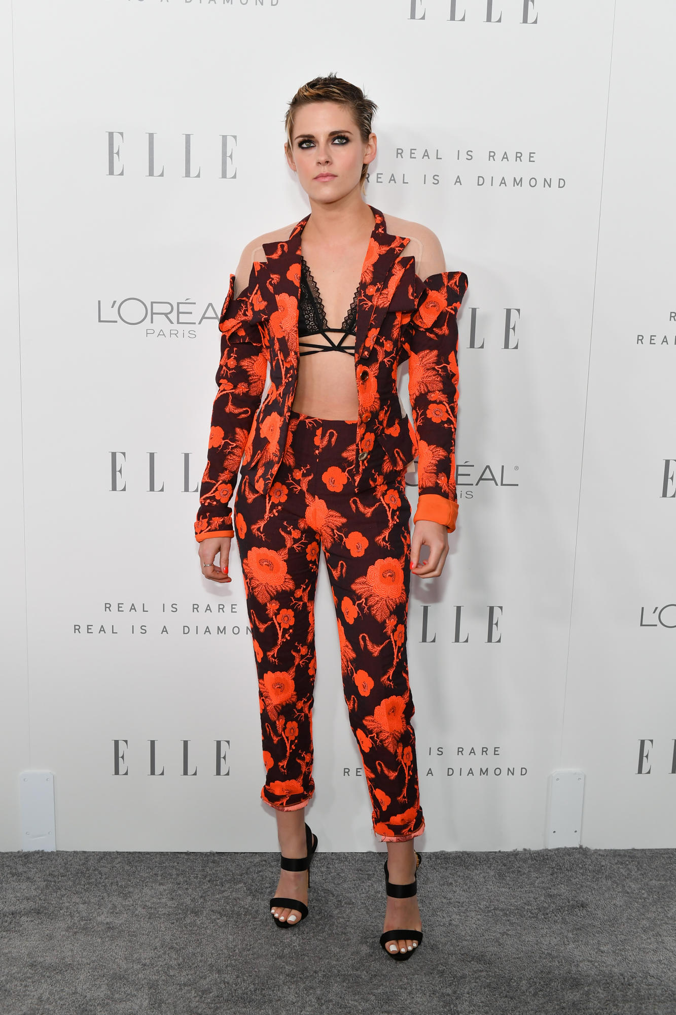 Kristen Stewart went bold in a printed Antonio Berardi suit with a black bra top. I live for her style!
