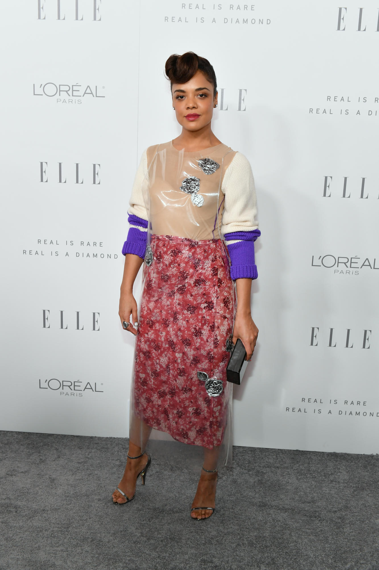 Tessa Thompson couldn’t be missed in a mixed media Calvin Klein 205W39NYC frock.