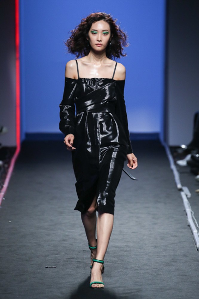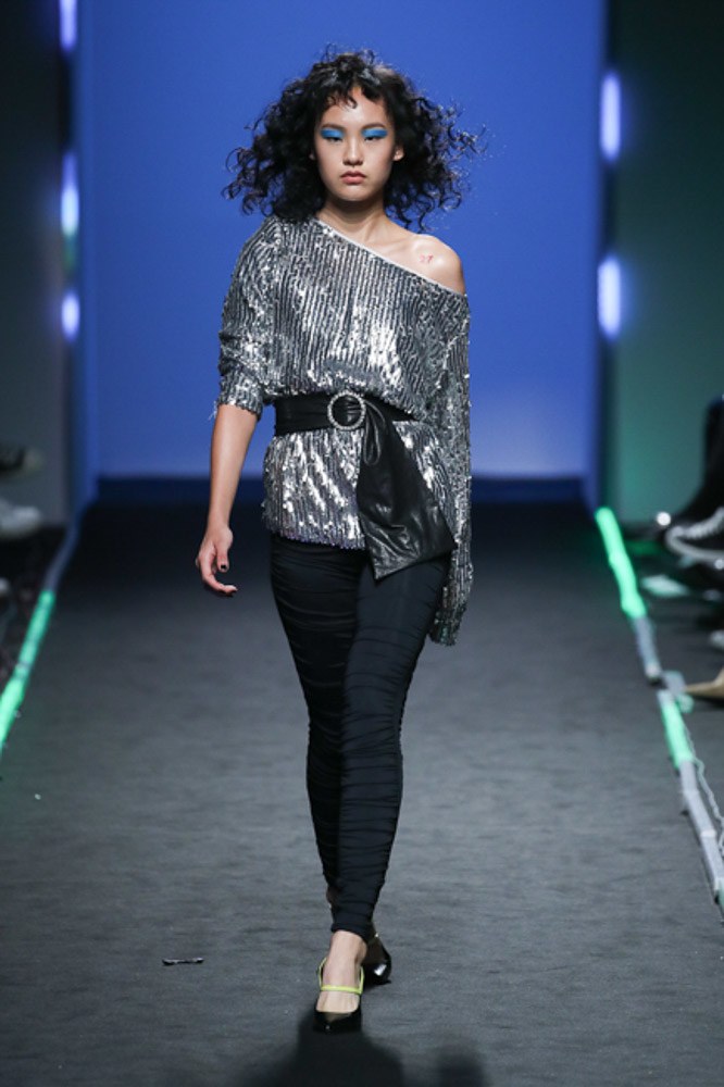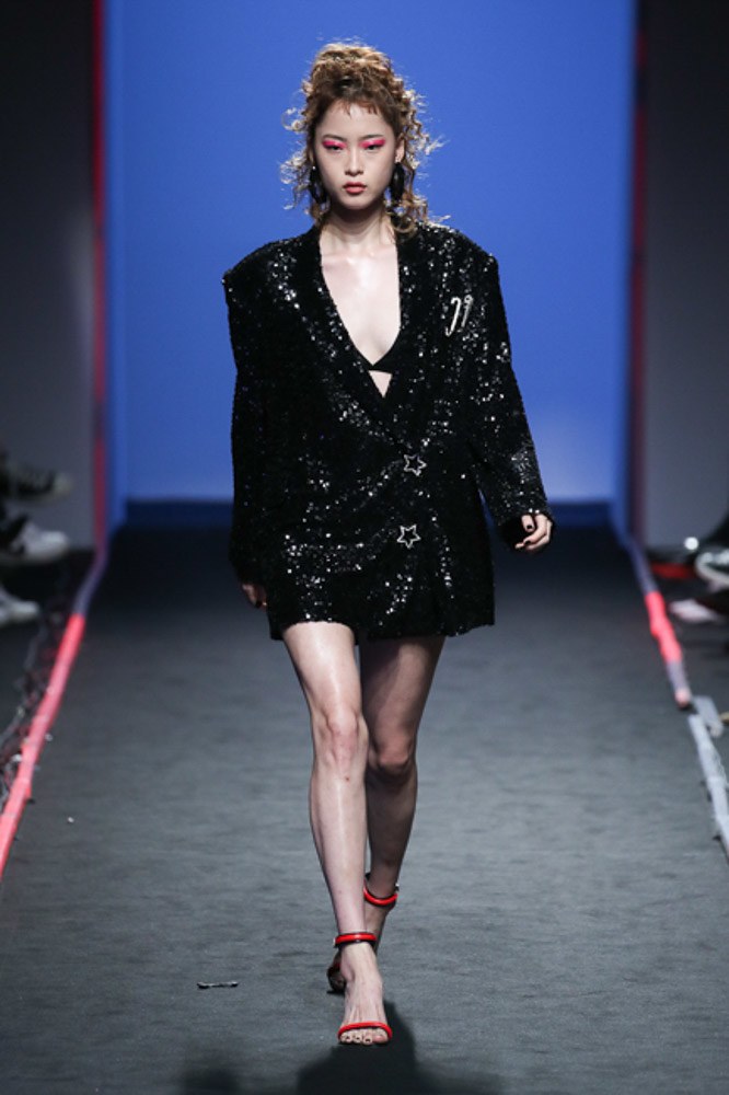 Sequins injected sparkle into the collection on short-sleeve crop tops, mini skirts, boxy power blazers worn as dresses, and off-the-shoulder tops. Simple ankle-strap sandals in red and black ensured none of the shoes took away from the power of the looks.