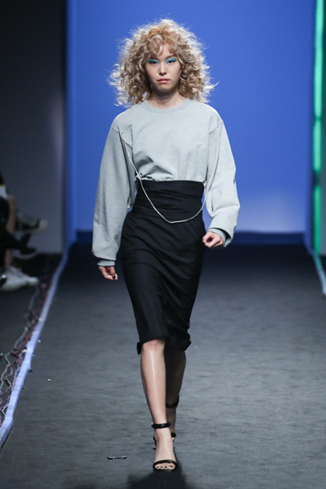 A sweatshirt tucked into a high-waist pencil skirt felt totally accessible and modern, but blue eyeshadow made even the most pared-down look lively—with that impossible-to-miss 80’s flair.