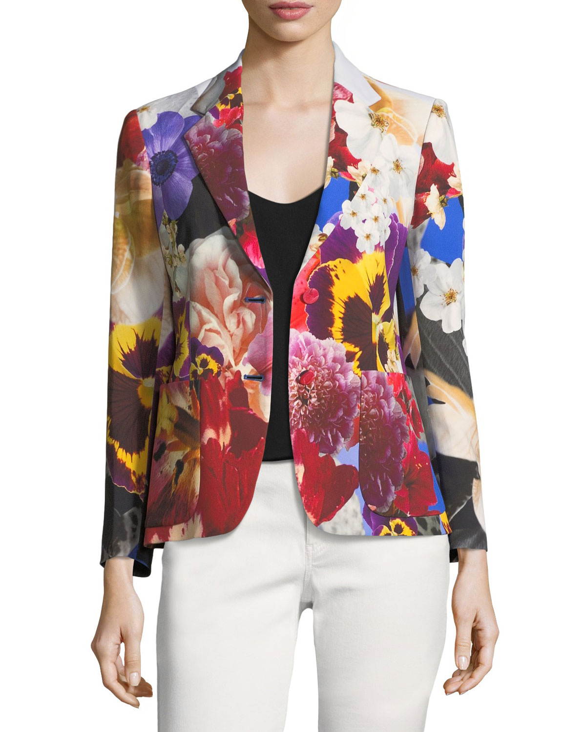 Her floral-print blazer features peak lapels, a single-breasted silhouette, long sleeves, button cuffs, and front patch pockets.
