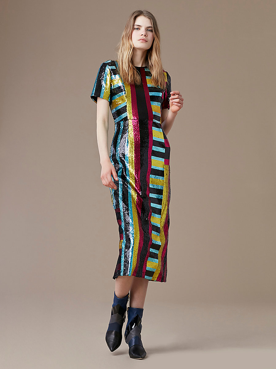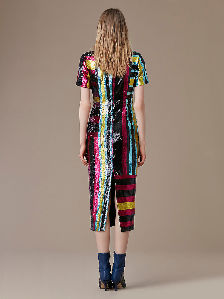 Her fully-lined multicolor stunner boasts resplendent small-scale, printed, couture-grade sequins, and short-sleeves.