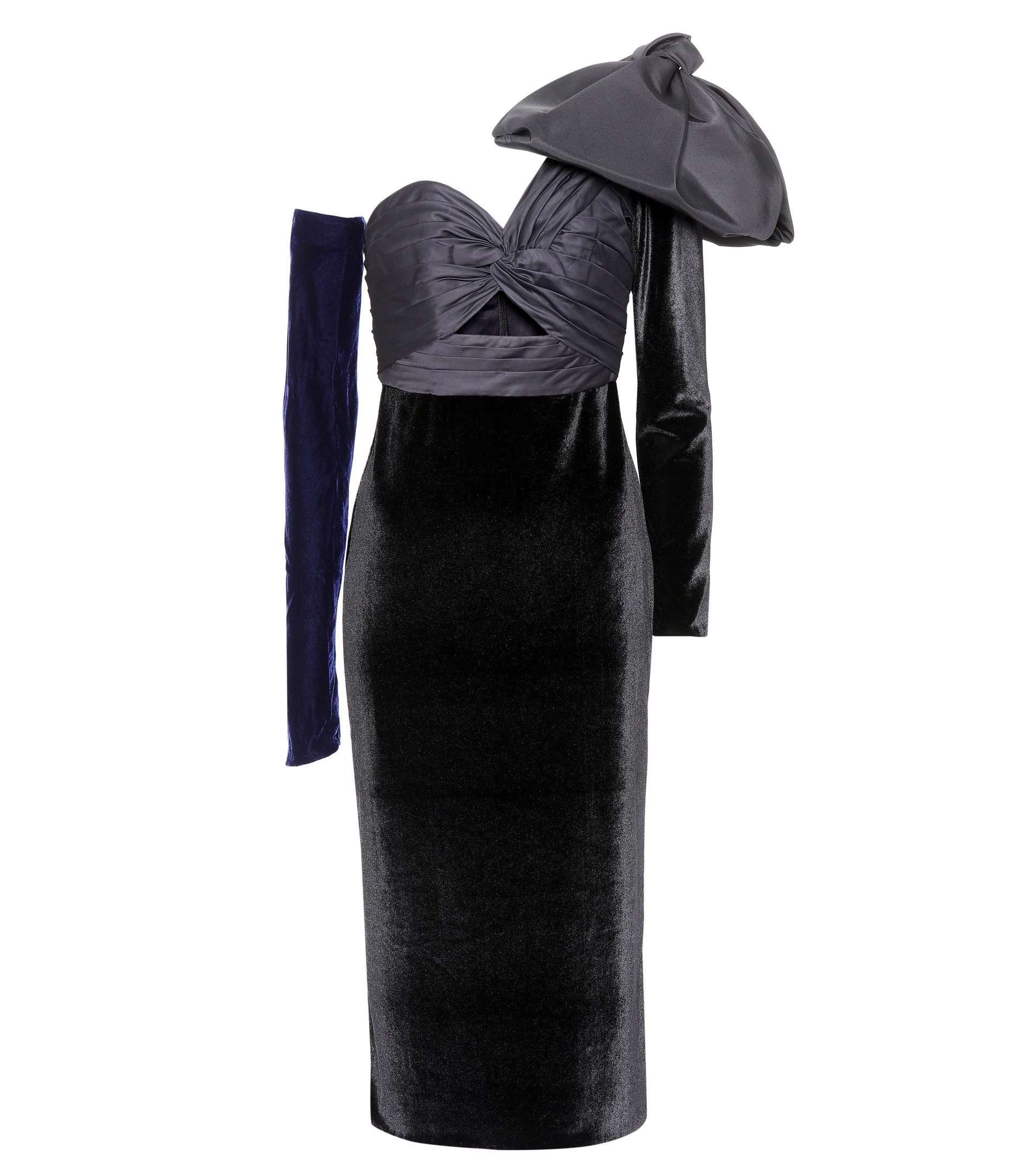 Her LBD features a soft velvet skirt and sleeves, knot detailing at the bust, cutout accents, and an oversized bow at the shoulder.