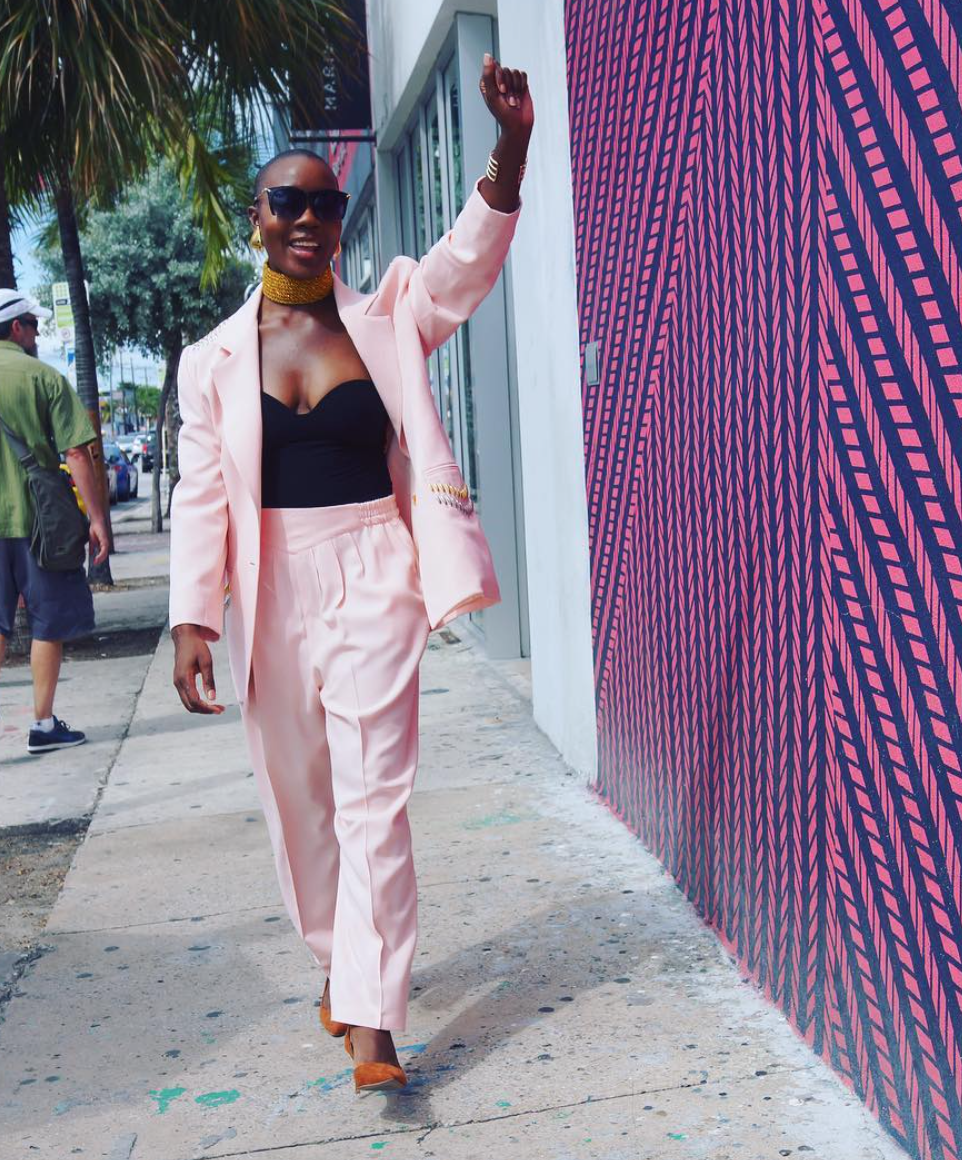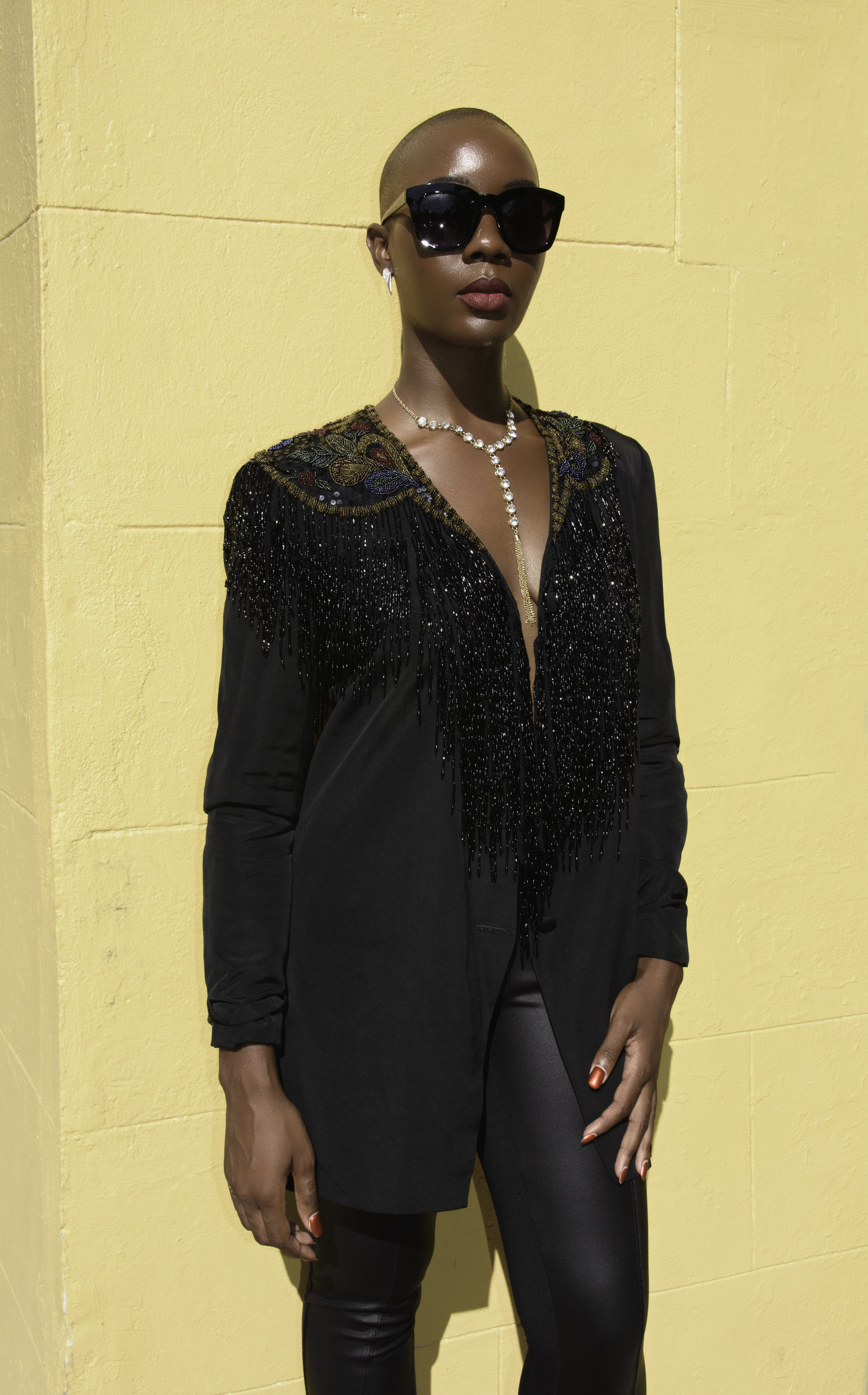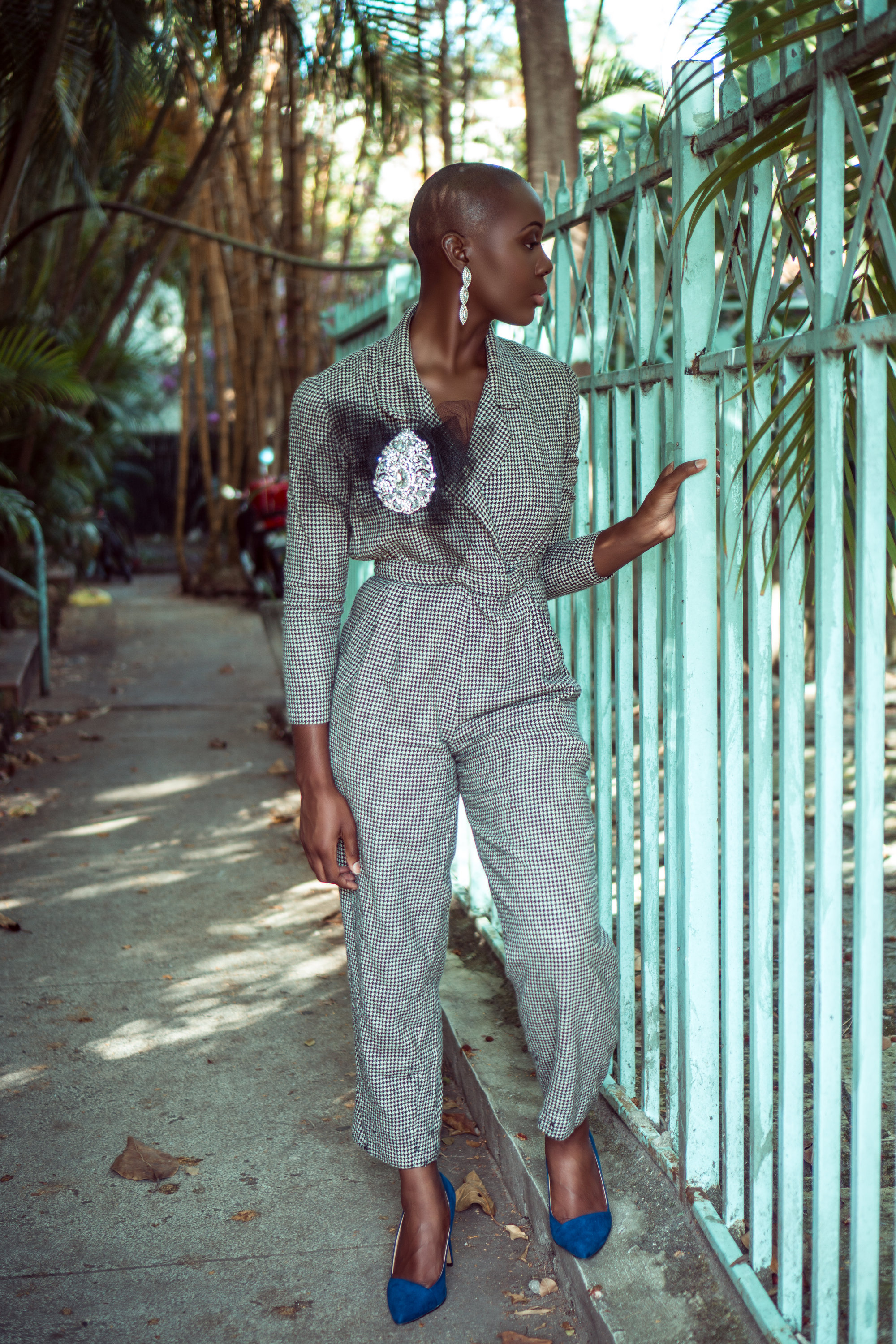 “With no hair to worry about, I like to put an extensive amount of effort into my bold accessories, particularly earrings, since they are my favorite accessory.”