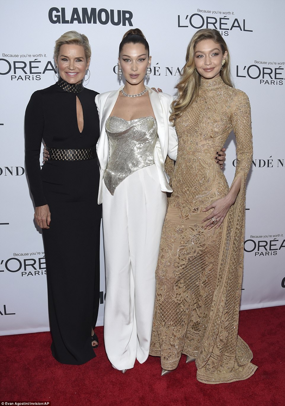 Bella and Gigi Hadid stepped out with their mom for a celebratory night. Gigi, who won “The Supernova” award was clad in a Zuhair Murad Fall 2017 Couture look, while Bella opted for a Cristina Ottaviano ensemble.