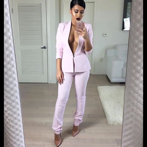 Crafted from a chic stretch crepe fabric, this two piece features a tailored fit and sexy deep plunge at the front along with pencil cut trousers.