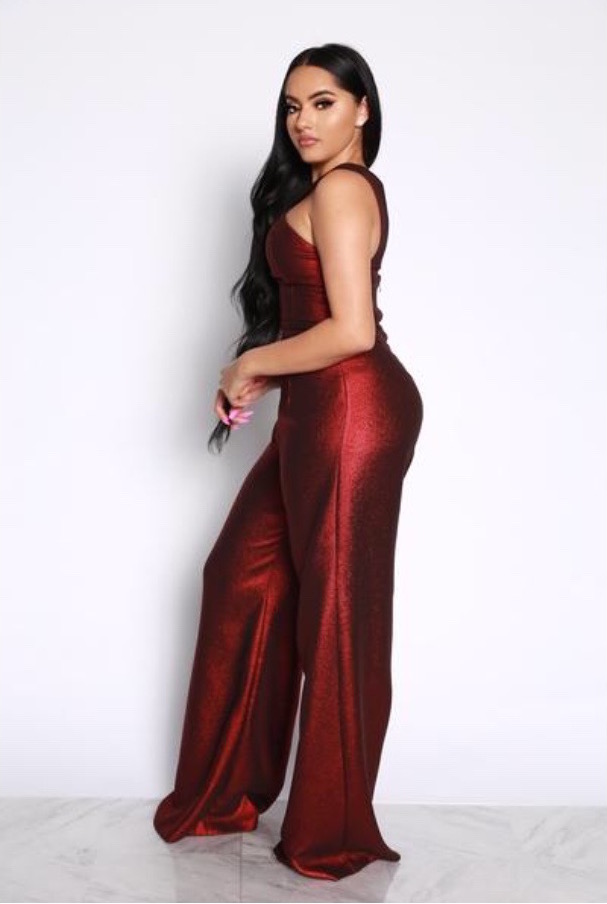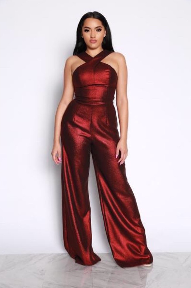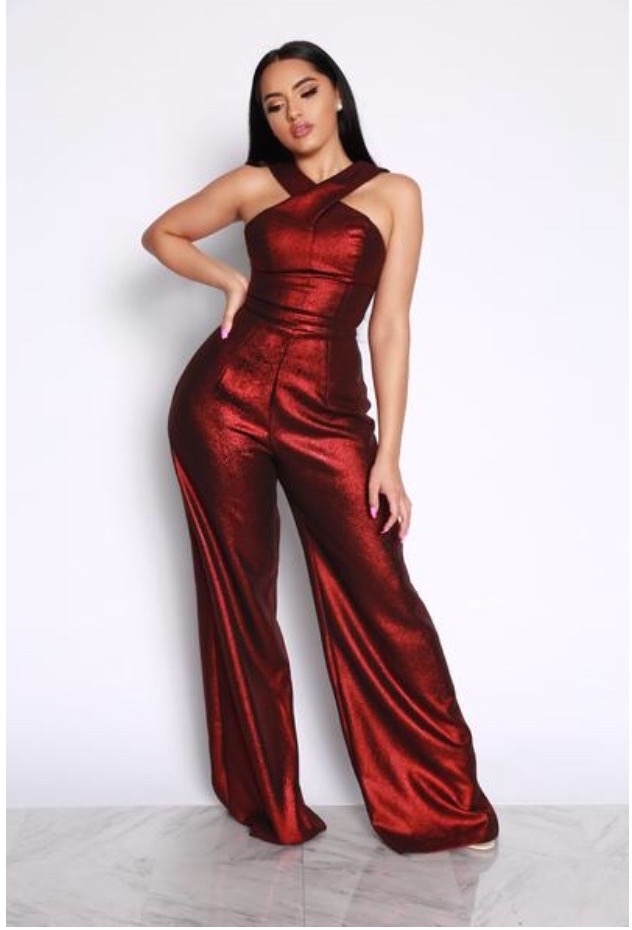 Crafted from a metallic stretch polyester fabric this stunner features a cross neck silhouette, a wide leg design and a hidden center back zipper. Hot!