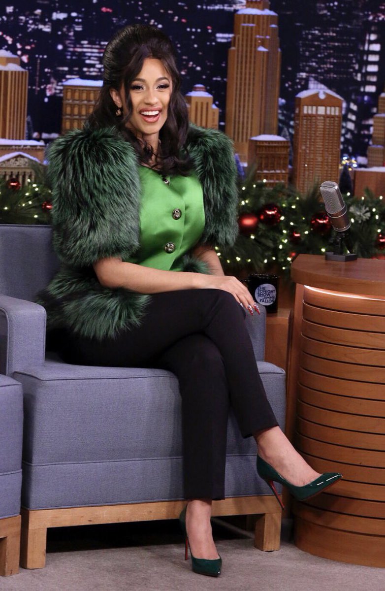 Cardi B in Rubin Singer: 15, 524 LikesOur girl Cardi changed her style up for her appearance on the Jimmy Fallon show this week and everything about it was bomb! She opted for a Rubin Singer top with loads of fur— because how else could she come? She finished her look off with Milly trousers and a green pair of her bloody shoes! Let’s not forget the hair bump, I see a ’70s trend coming back. I love the fact that she can switch things up and still beam with confidence. A true bombshell!