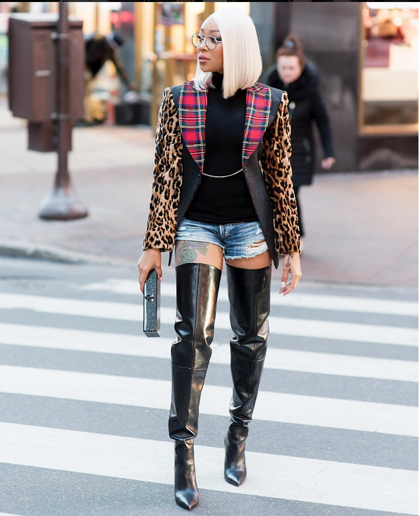 Monica in Junya Watanabe Comme des Garçons: 14, 165 LikesMiss Monica Brown— Can she do any wrong? All year long she has been killing looks from her day to day looks to her stage looks for the Xscape tour. This week, she hit up the streets of Philly in a statement blazer by Junya Watanbe Comme des Garçons, paired with denim shorts and thigh-high Balenciaga boots. This is such a bomb simplistic look that the blazer took to a different level of slay!