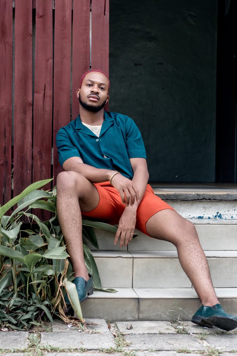 He isn’t afraid to show off a little skin and vibrant colors are treated as his statement pieces. This may explain his clothing line @orangecultureng, an “androgynous” menswear line that expresses Nigerian culture vividly through his lens.
