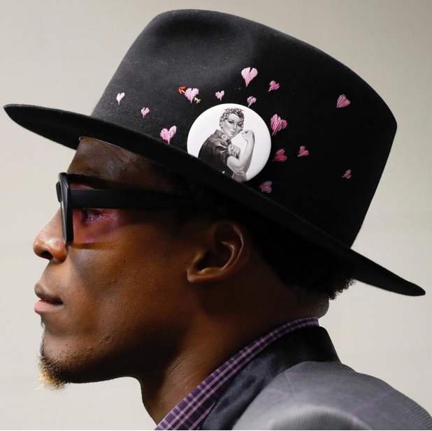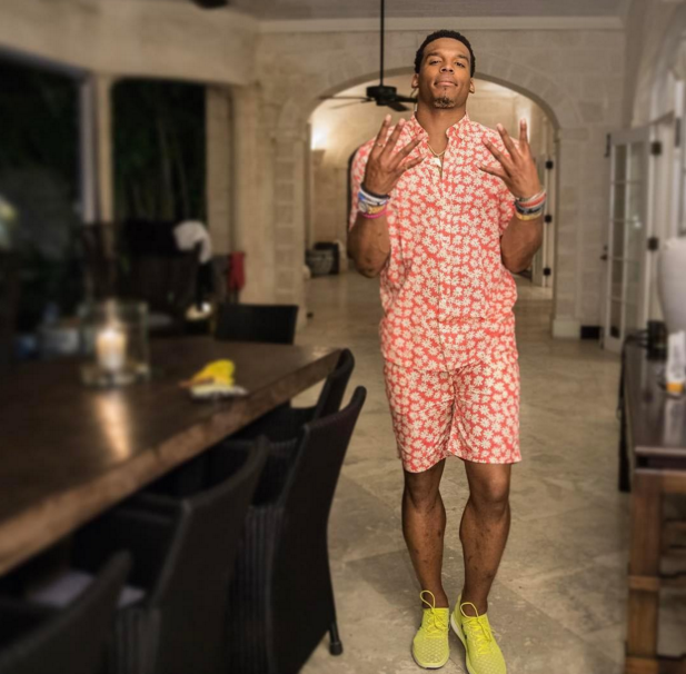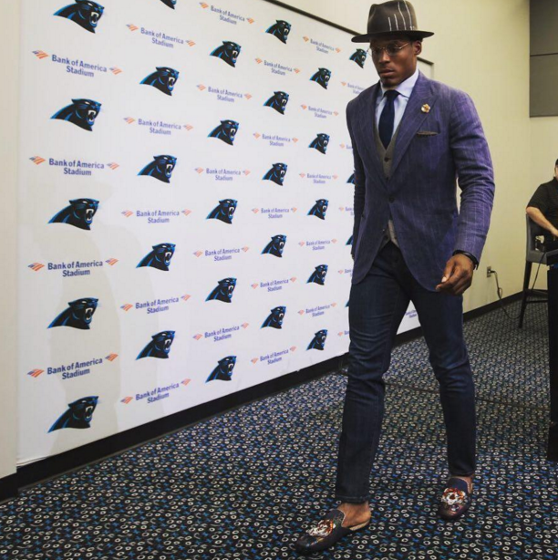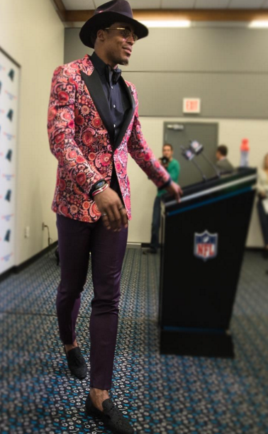 - Cam Newton loves mixing prints to showcase his big and eccentric personality. The fashion forward quarterback doesn’t mind pairing a pink suit, checkered shirt with a striped bow tie for a press conference; as long as he can rock a stylish fedora, he’s game!