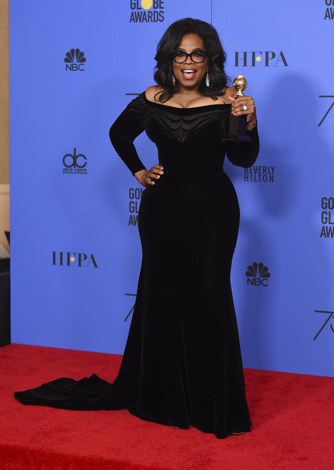 Oprah Winfrey in Atelier VersaceOprah Winfrey stunned on the carpet after being being the first black female to accept the Cecil B DeMille Award at the 75th Golden Globes. She showed off her curves in a form fitting off-the-shoulder Atelier Versace gown. Ms. Winfrey is simply stunning! There are no other words for this jaw-dropping statement!