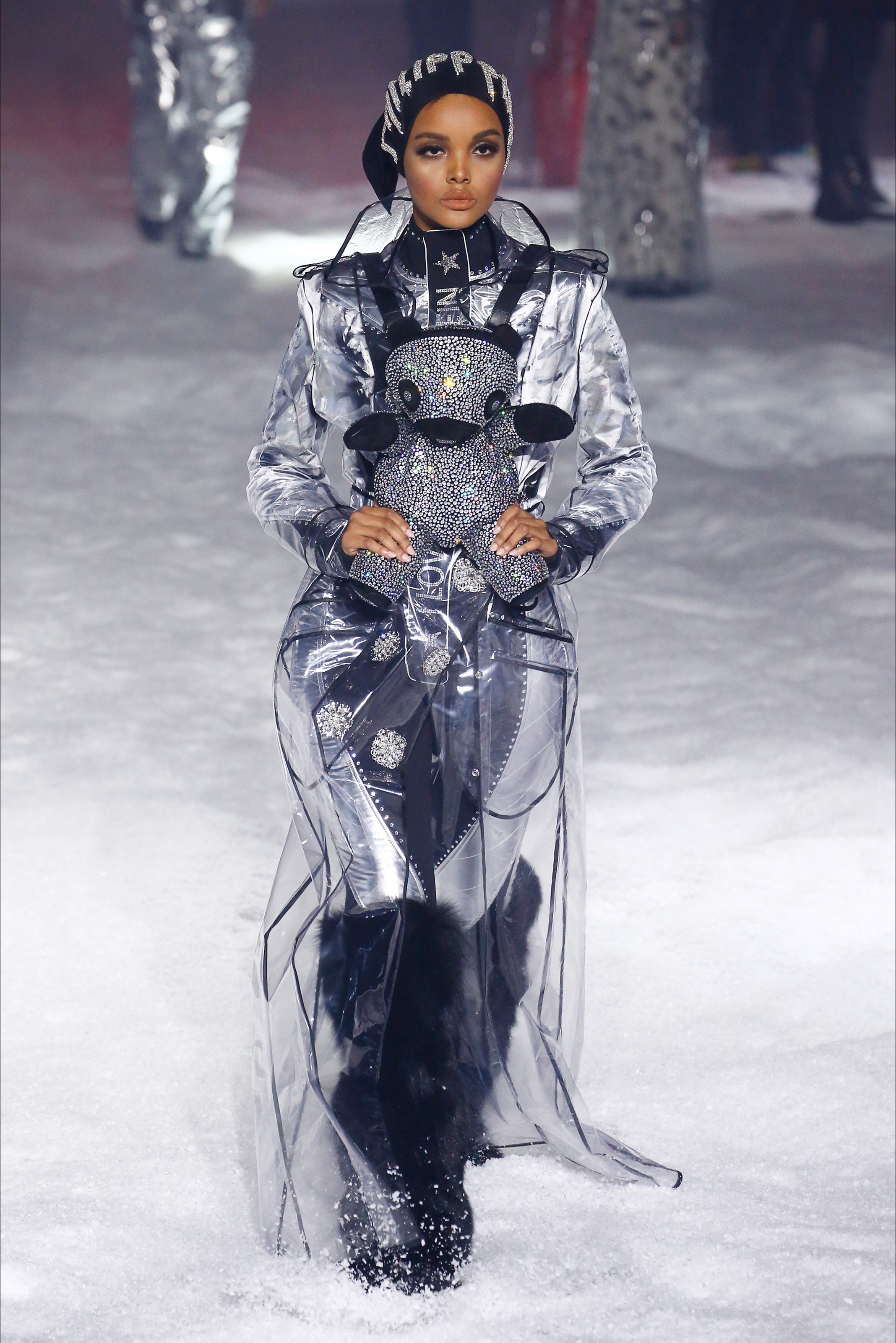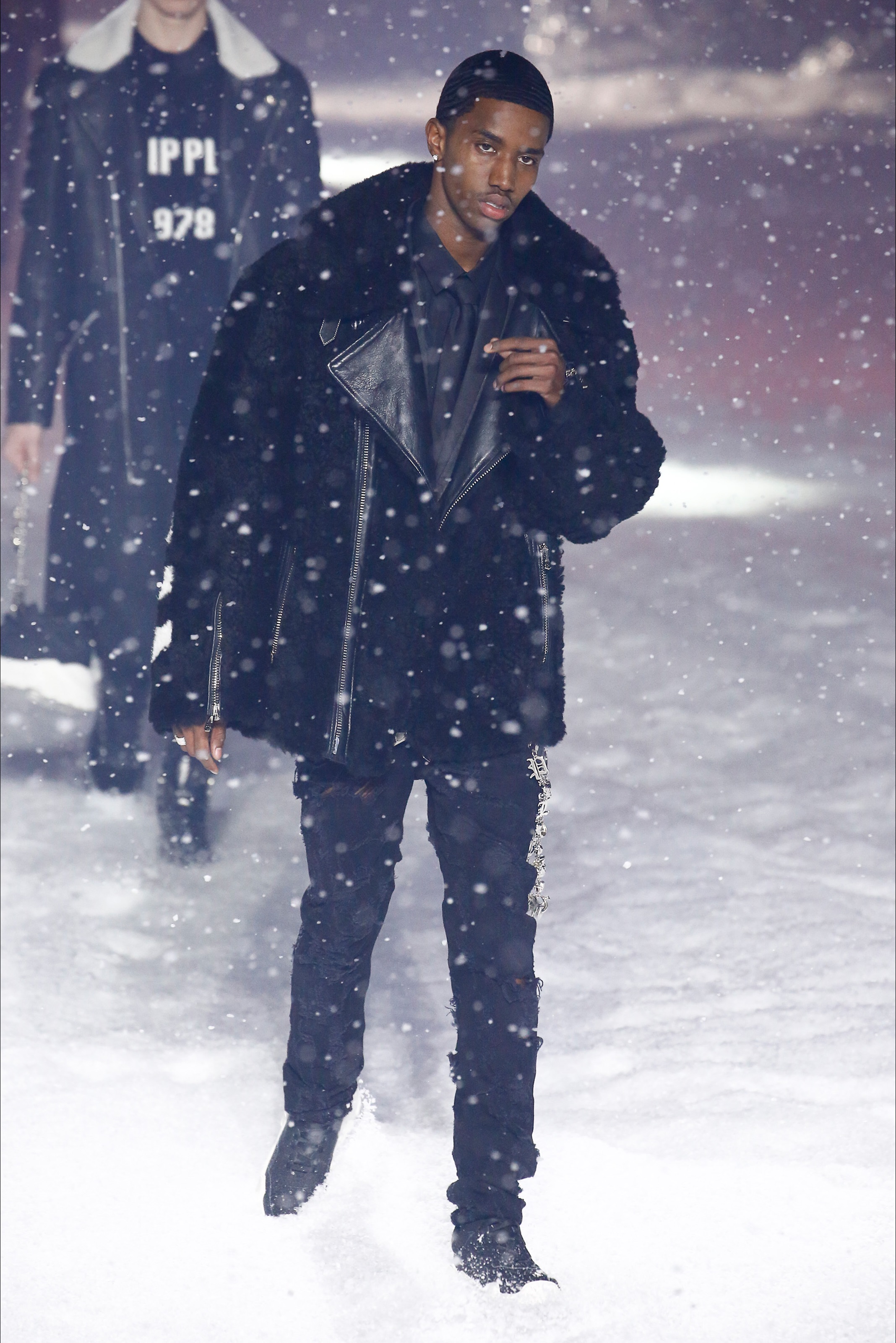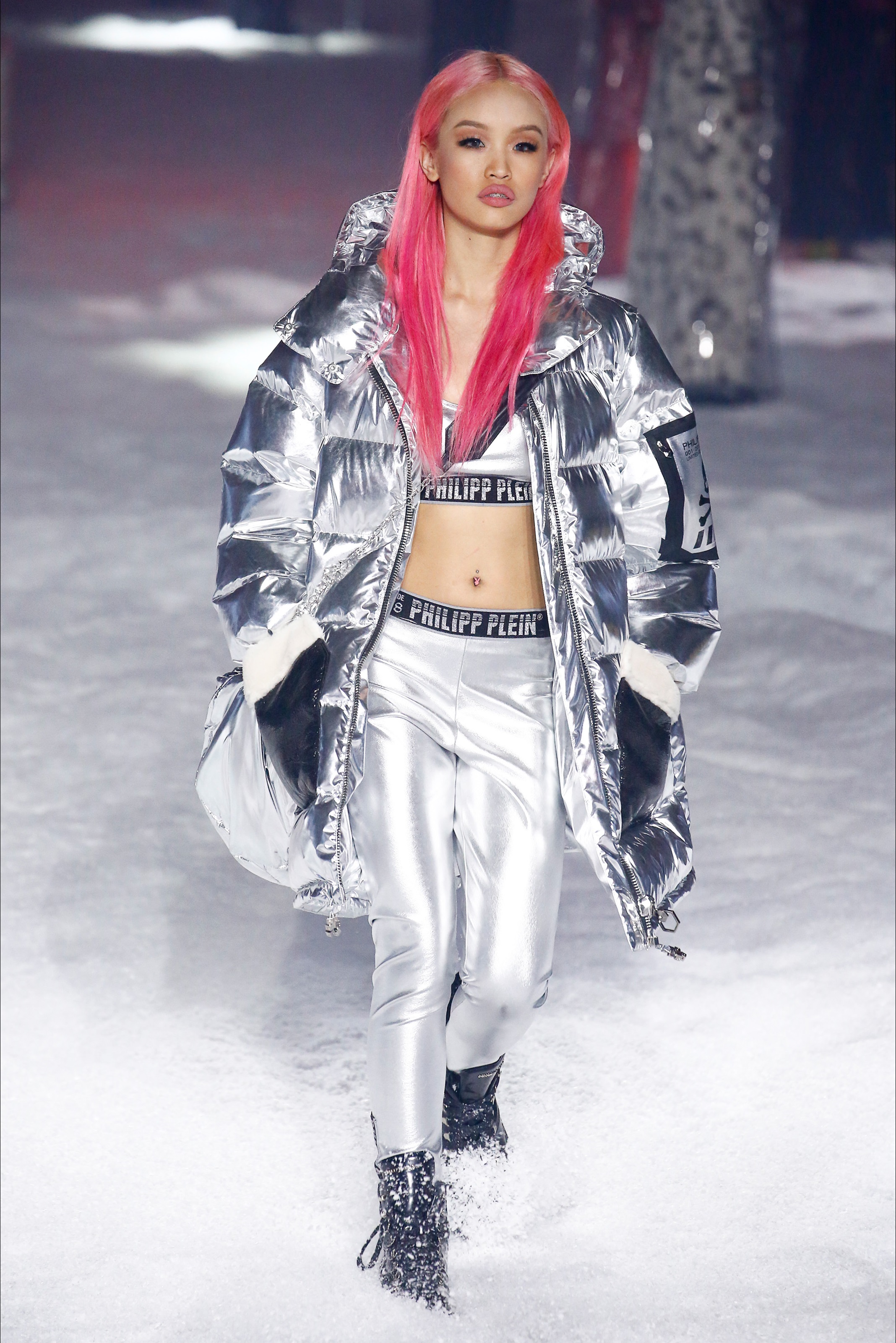 Last season, Philipp Plein’s show broke the internet with a hot strut on the runway by Teyana Taylor and performances by Future, Nicki Minaj, Yo Gotti, 21 Savage, and more. This season it was a futuristic Winter Wonder land on night 3 of New York Fashion Week as guests arrived to the industrial Brooklyn Navy Yard. Greeted by massive foil structures, faux snowflakes on the ground, and falling snow it was an exciting experience. The show opened with a bang featuring a performance by Rich the Kid rapping his hit song ‘New Freezer’ which has recently had social media in a frenzy followed by an opening walk from a Philipp Plein text logo emblazoned robot alongside Victoria’s Secret model Irina Shayk.