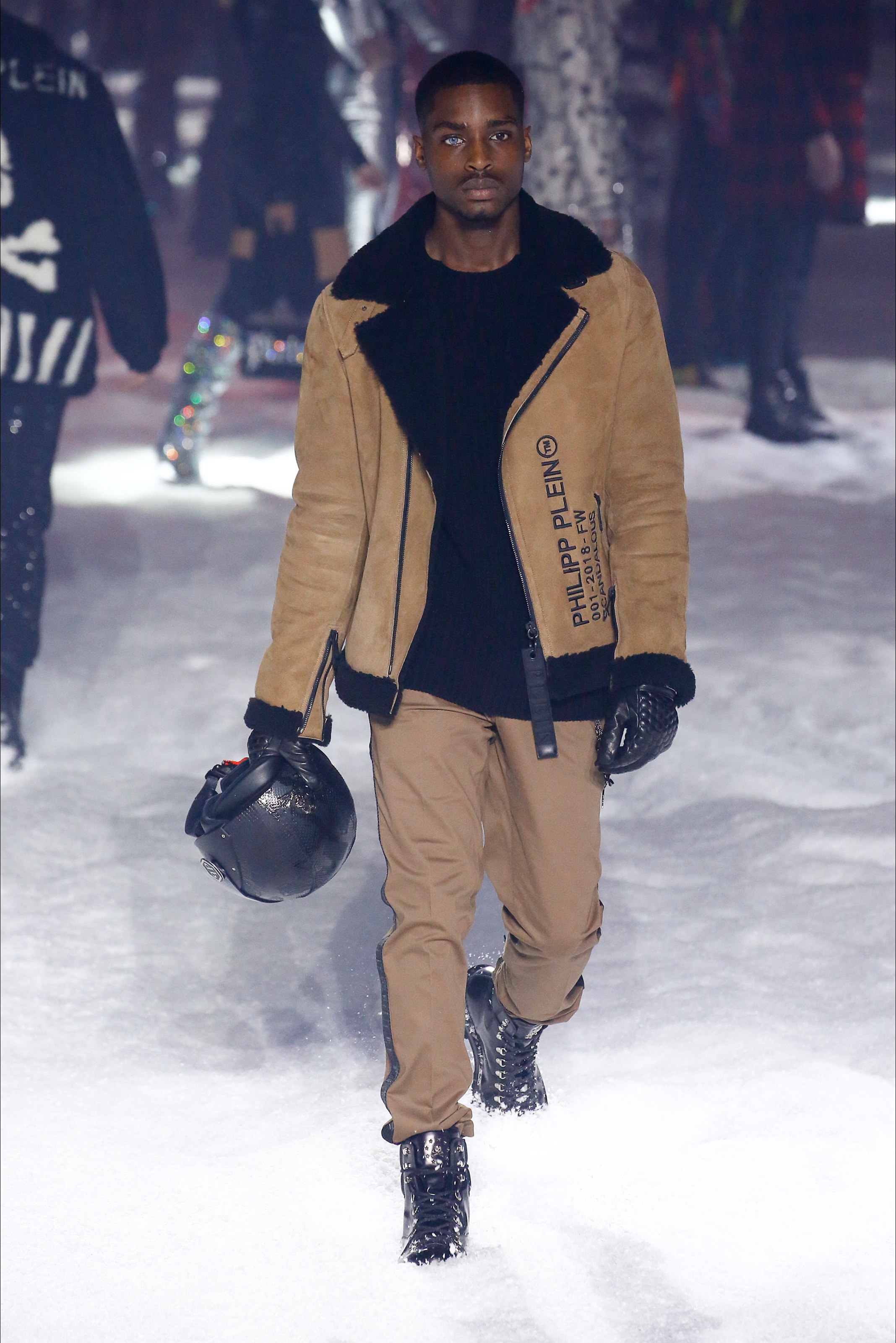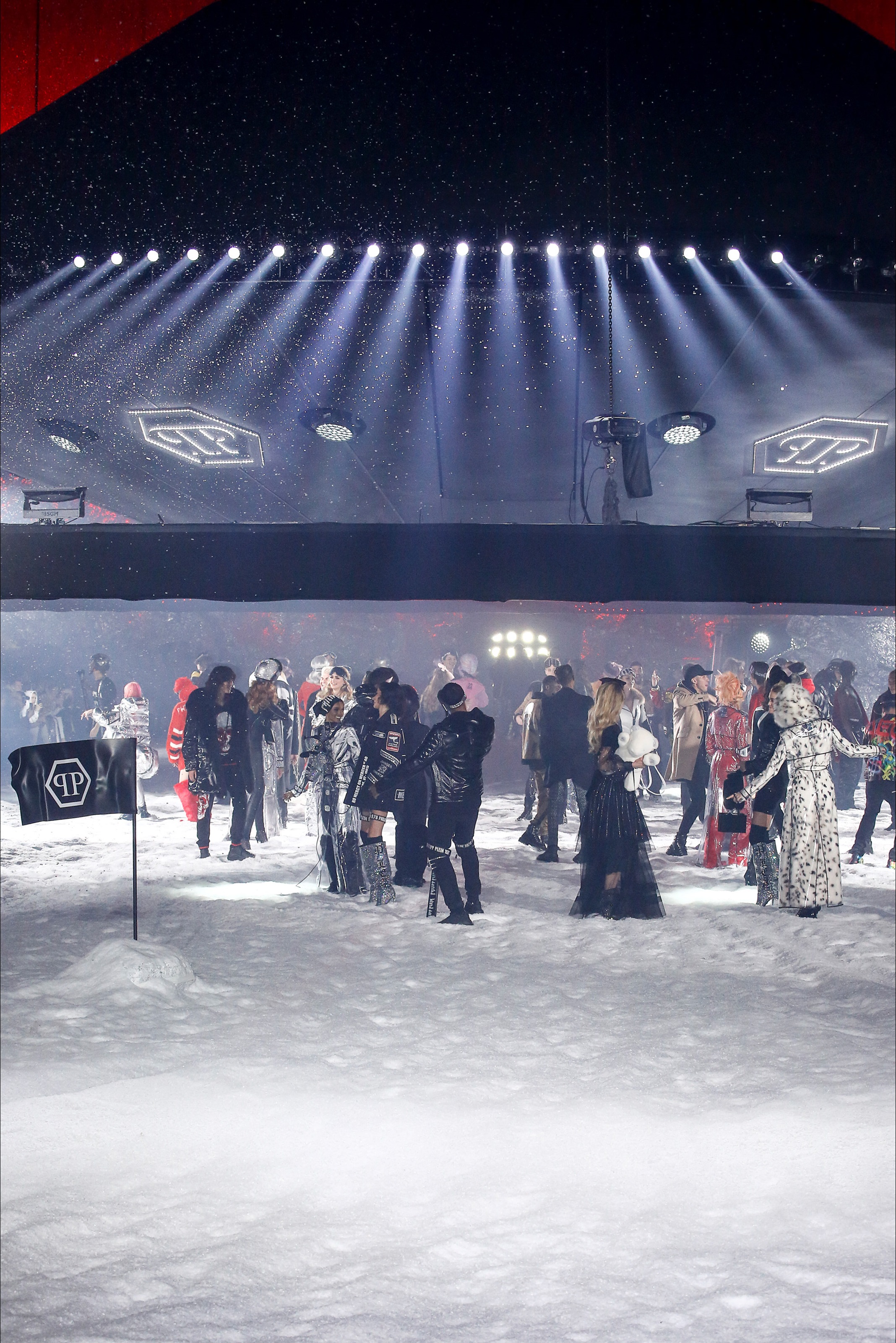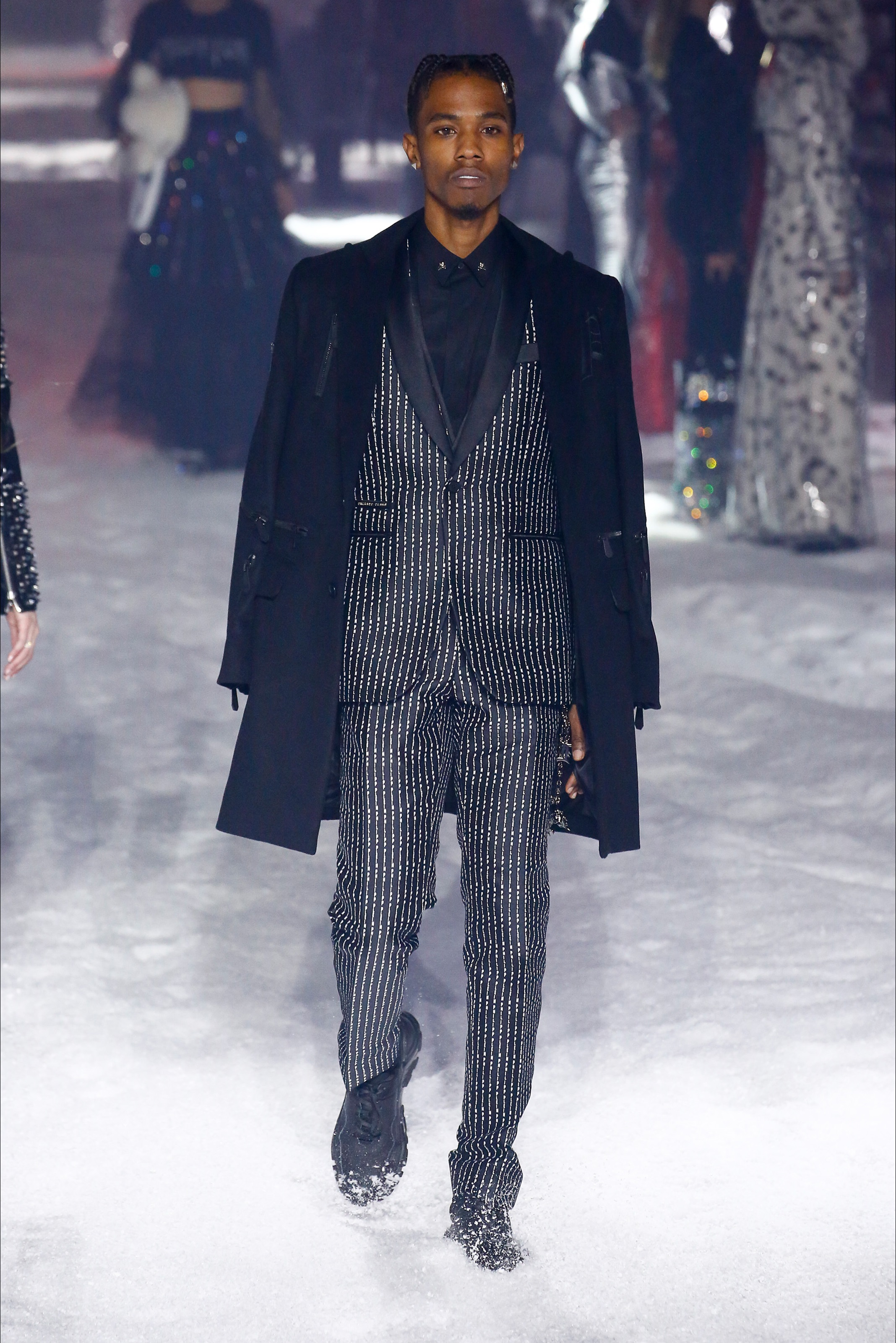 Last season, Philipp Plein’s show broke the internet with a hot strut on the runway by Teyana Taylor and performances by Future, Nicki Minaj, Yo Gotti, 21 Savage, and more. This season it was a futuristic Winter Wonder land on night 3 of New York Fashion Week as guests arrived to the industrial Brooklyn Navy Yard. Greeted by massive foil structures, faux snowflakes on the ground, and falling snow it was an exciting experience. The show opened with a bang featuring a performance by Rich the Kid rapping his hit song ‘New Freezer’ which has recently had social media in a frenzy followed by an opening walk from a Philipp Plein text logo emblazoned robot alongside Victoria’s Secret model Irina Shayk.