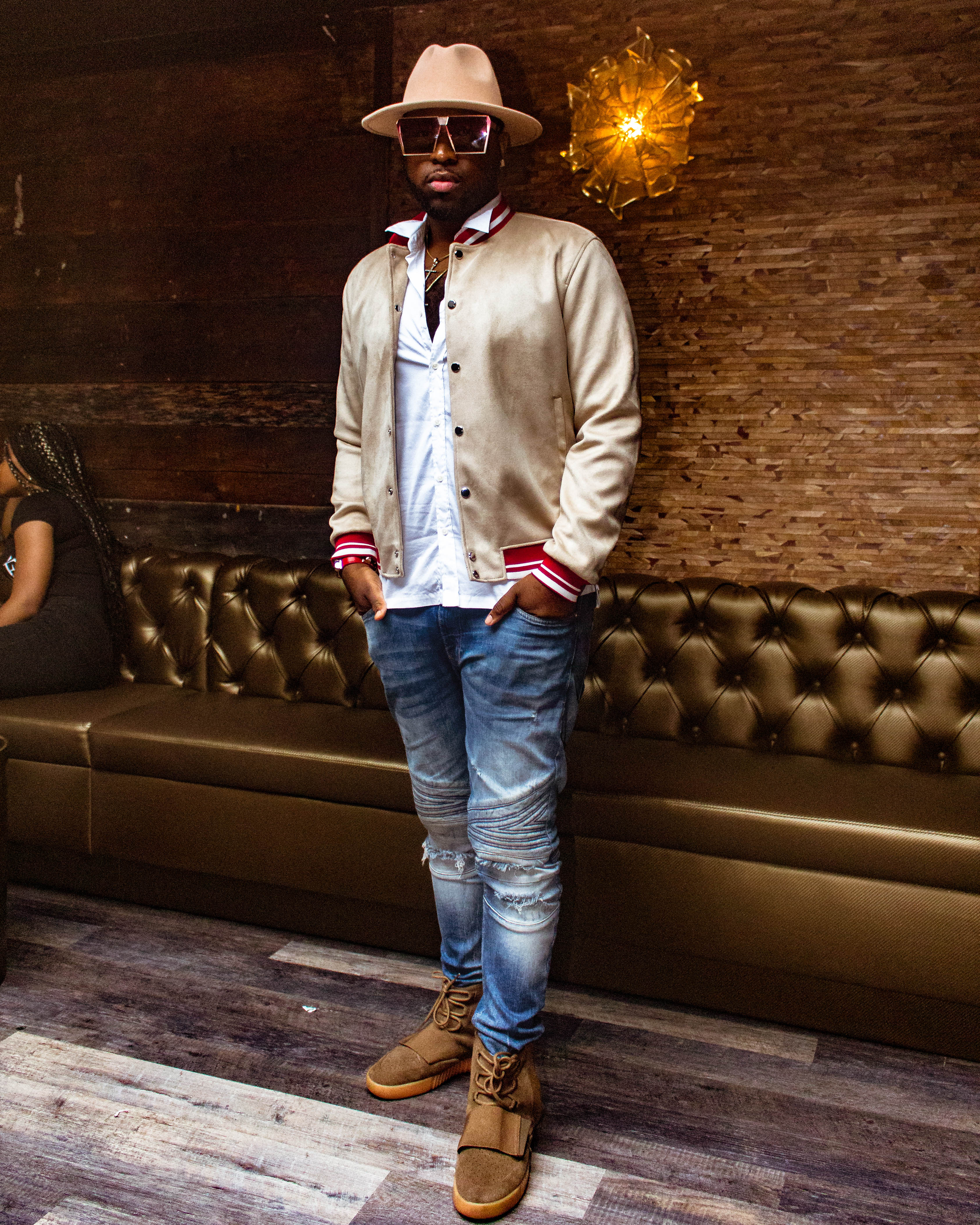 Wardrobe stylist, @kidear came to kick it outfitted in a suede bomber and a matching fedora.
