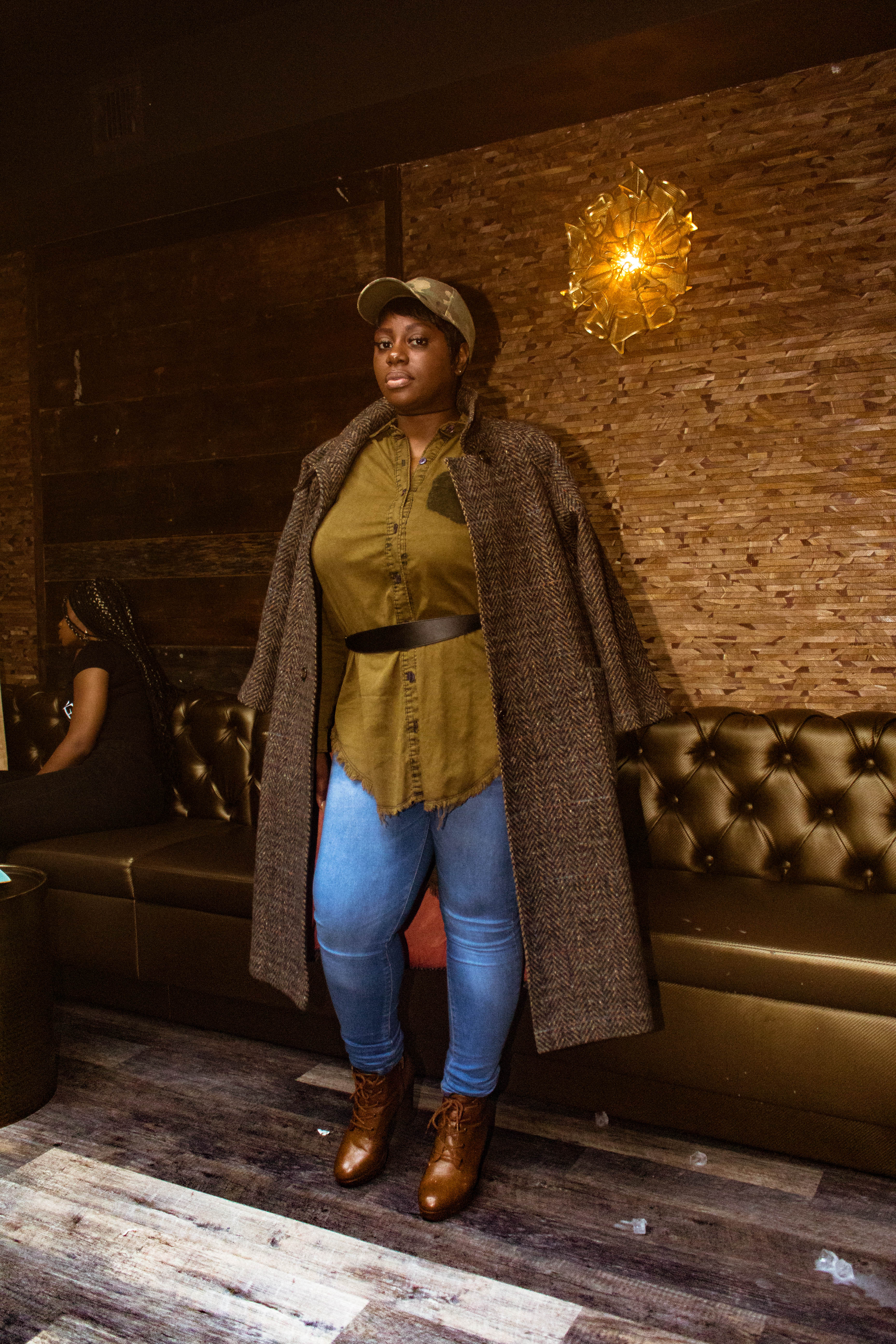 For her rainy day style, @mariedriven stopped by to sip and brunch in a vintage coat, denim and a camouflage hat. Cute!