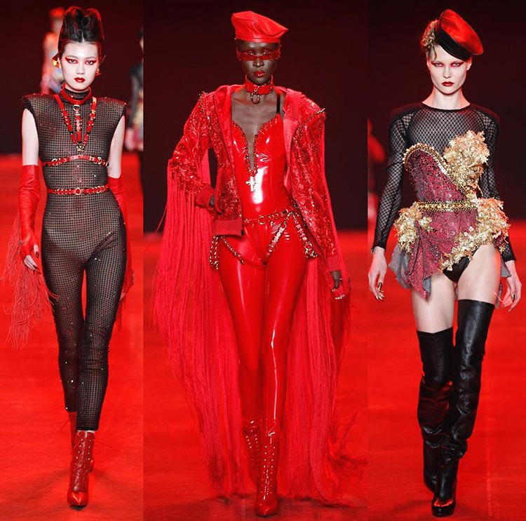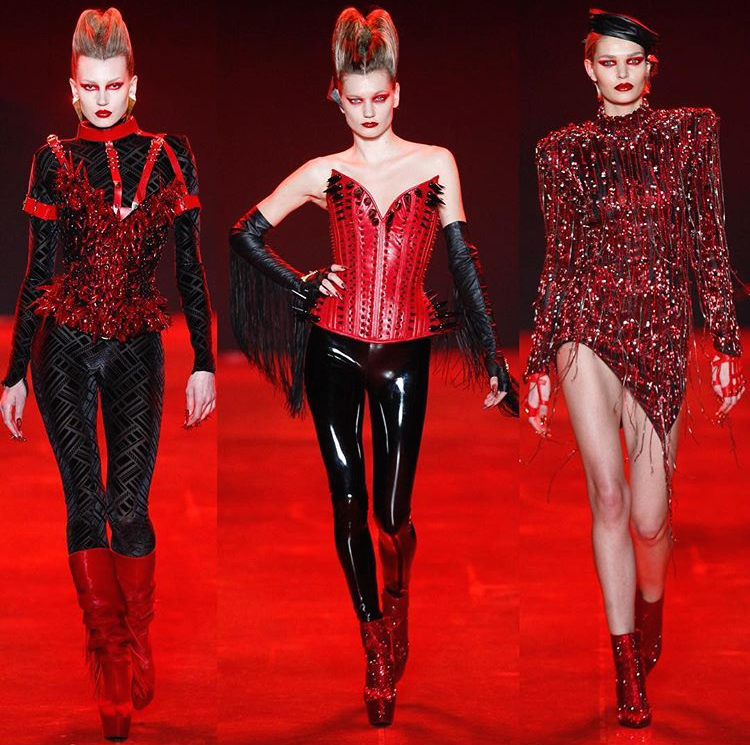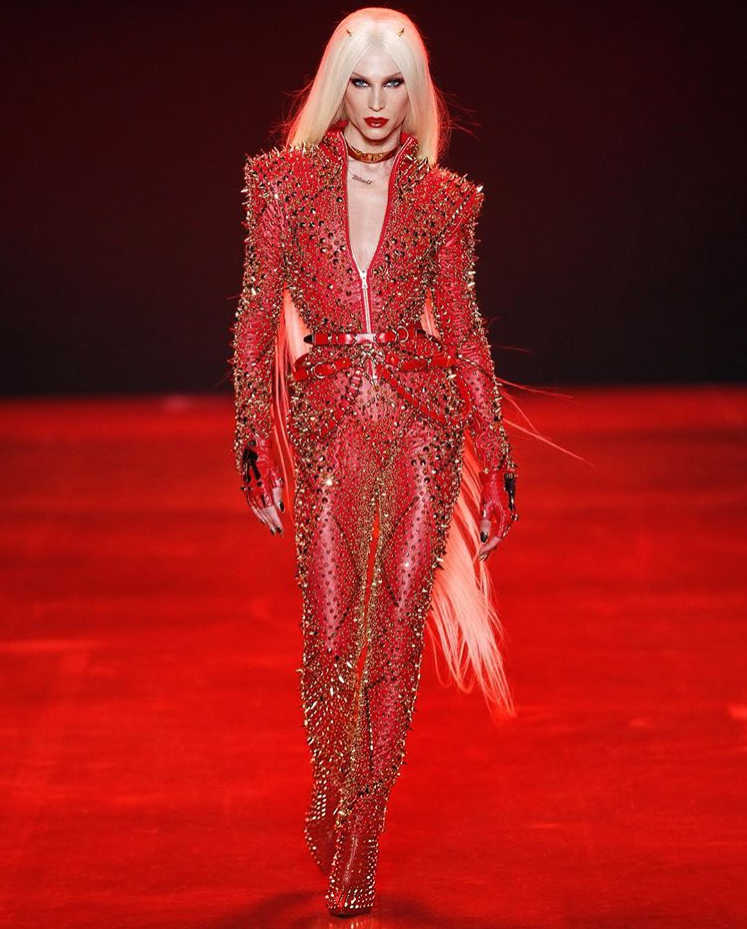 The designer set the mood donning a flaming red latex jumpsuit adorned in spiked embellishments. Inspired by the everlasting struggle between good & evil the Blonds Fall/Winter 2018 presentation took their audience on a polarizing adventure.
