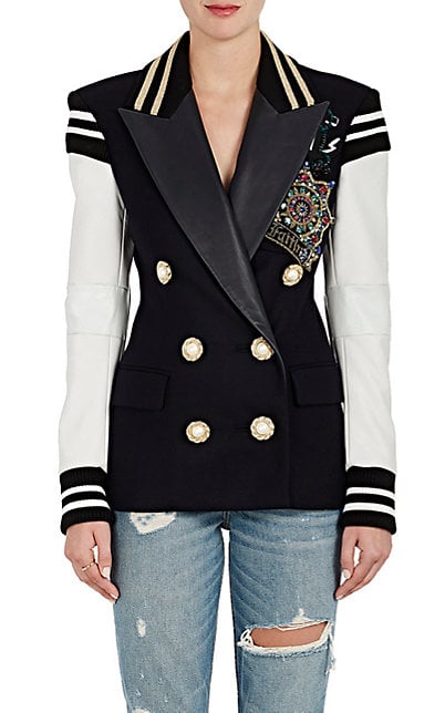 The double-breasted jacket features a colorful embellished brooch that takes the fit from simplistic black and white to bomb! With padded shoulders detailing and a mix of leather and wool, the jacket makes a statement alone!