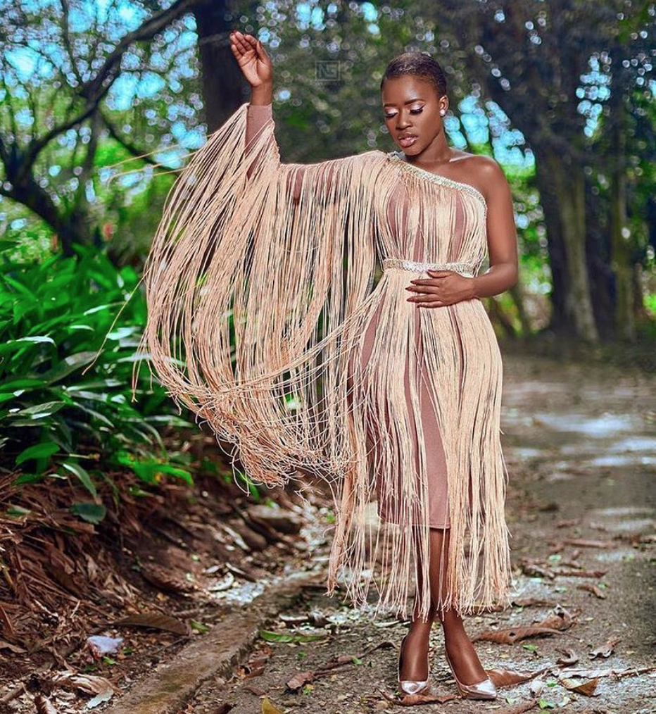 Ghanian Actress, Makafui Fella in Moda Bertha (11,392 Likes)Wow! Makafui Fella wore a head turning one-shoulder fringe dress by Moda Bertha. The stunning dress accentuated her curvaceous figure while still drawing attention to the amazing fringe detailing. The actress topped the look off with a metallic pointy toe pump with matching make-up that really leveled up the glam. Beautiful!