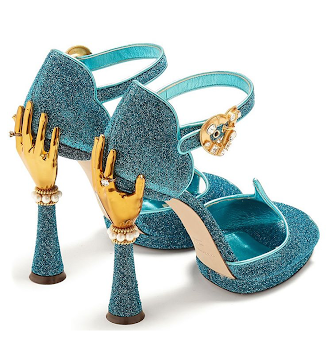 Retailing from $2,200 these dashing pumps are decorated with faux-pearls and crystals and are fastened with a heart-shaped buckle along with a gold-tone hand that sits atop a sculpted towering heel.