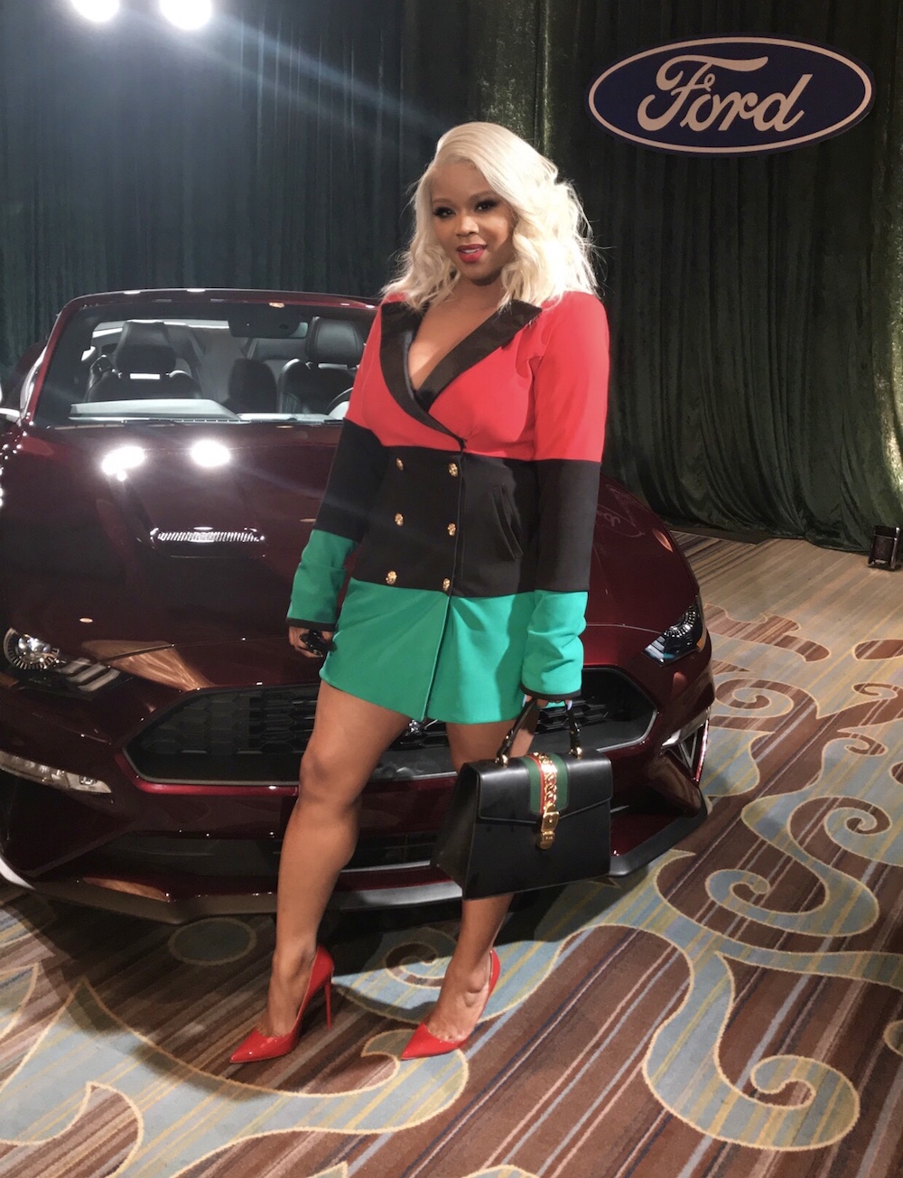 The red, black, and green colors were reflective of black pride and excellence; I accessorized with a Gucci bag from ShopClosetVogue.com and Louboutin heels.