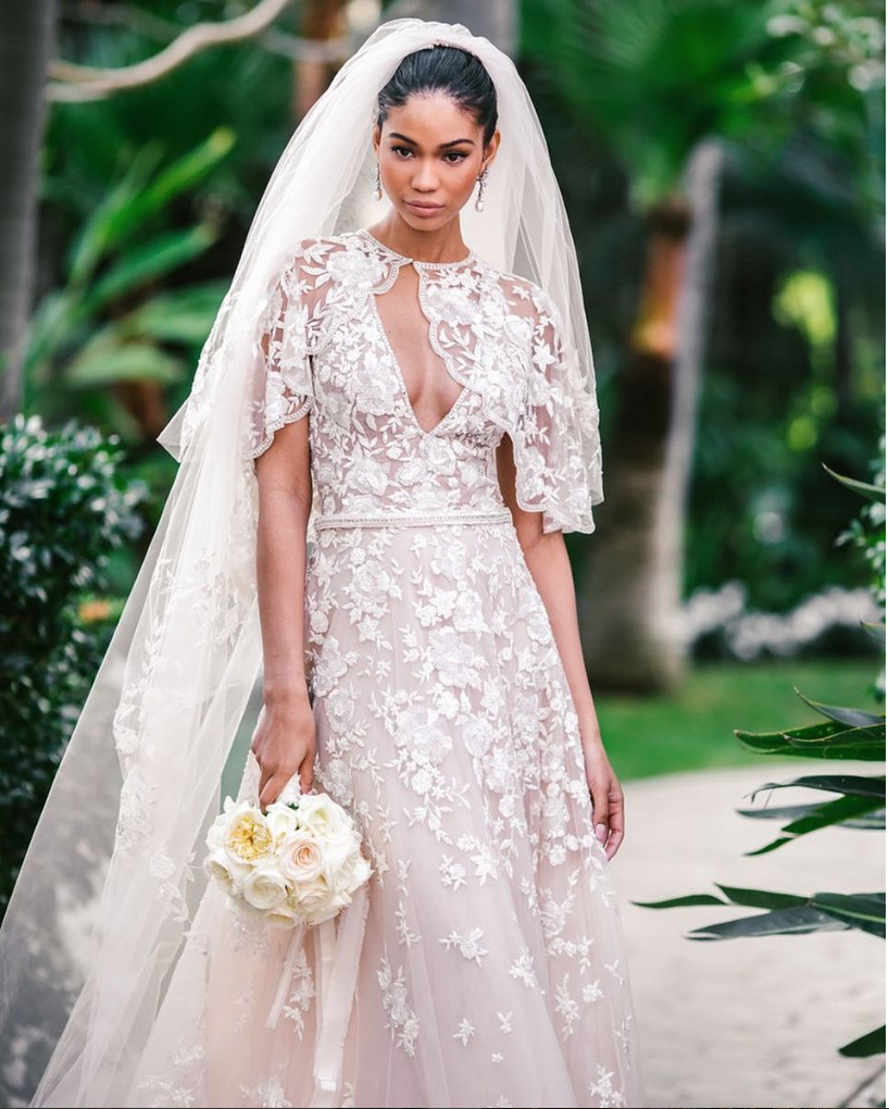 Chanel was a vision in a Zuhair Murad gown. The belted champagne dress looked beautiful on the supermodel. Mr. Shepard complemented his bride in a Hugo Boss ensemble.
