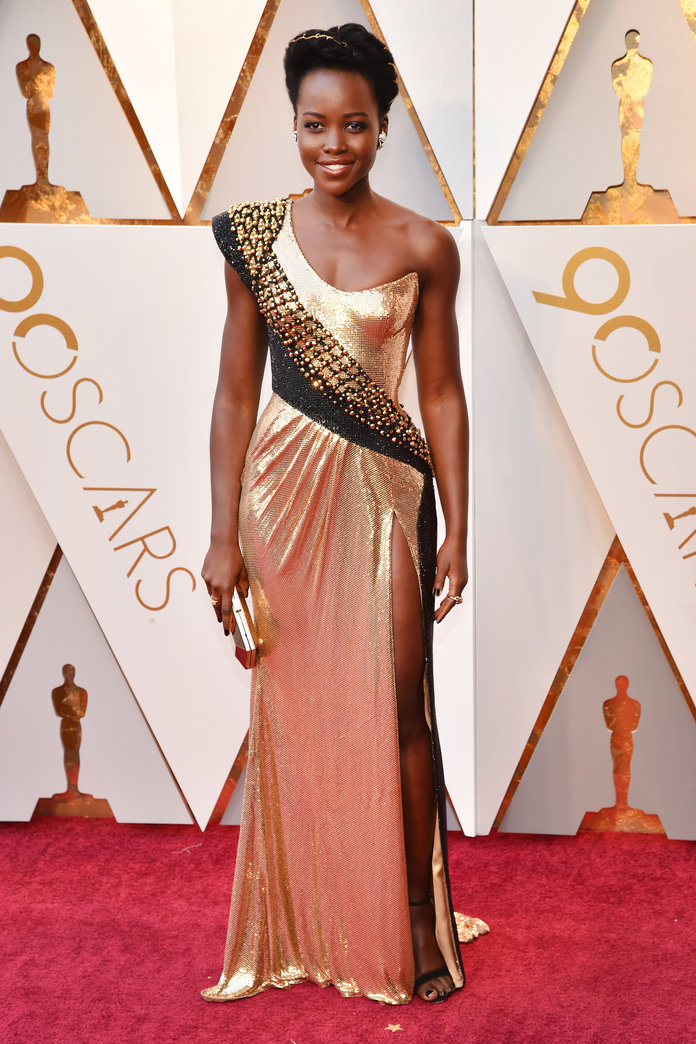 We can always count on Lupita Nyong’o to grace the carpet in an absolutely beautiful dress. She looked regal in a one-shoulder Atelier Versace dress. The shimmery dress screams glam! The details of this look is everything from the high thigh slit to the black and gold structured shoulder, to the gold wefted accessory in her hair. Divine!