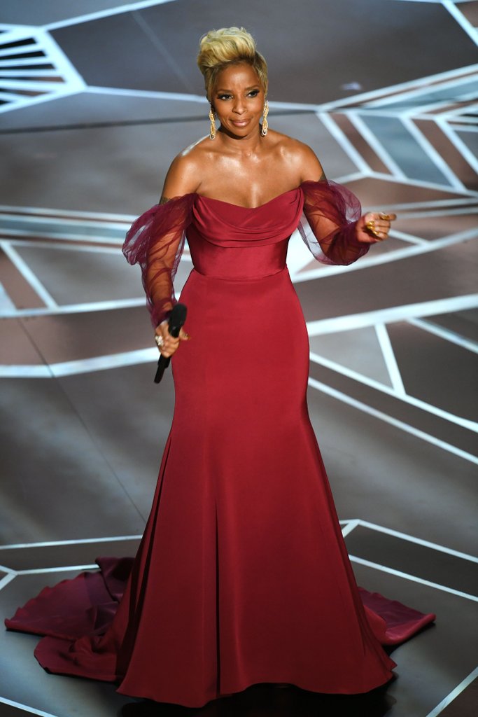 All Hail Queen Mary! Although she didn’t take home an Oscar, she did have a winning performance and she looked absolutely amazing. Mary J Blige sang “Mighty River” from “Mudbound” in a burgundy custom Vera Wang gown. Get into the off-the-shoulder tulle sleeves and the amazing fit on Mary’s curves. The gorgeous gown called for simple dangling earrings which kept the attention on the superb dress.