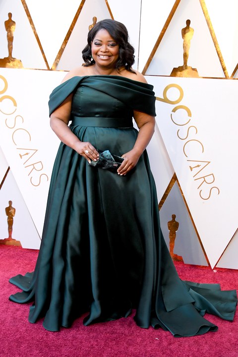 Octavia Spencer was a vision in Brandon Maxwell draped off-the-shoulder gown. The hunter green color certainly looks amazing on her and the waist cinching belt complements her body so well. What is not to love?!