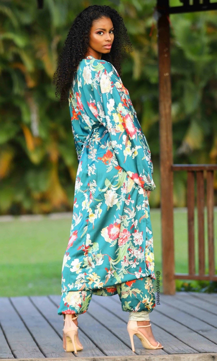 Made from rich fabric with a teal and green floral print this set features pants with a gorgeous gold elastic waist & ankle and a kimono that comes with an adjustable tie waist.