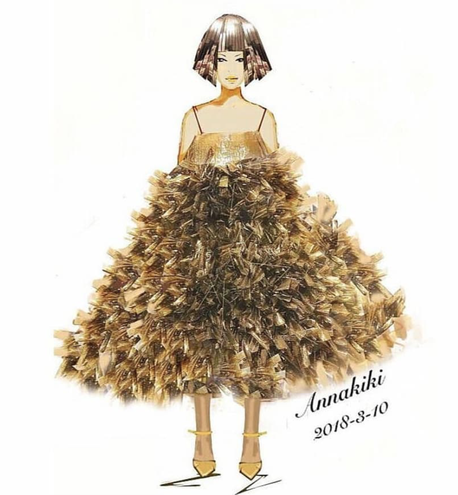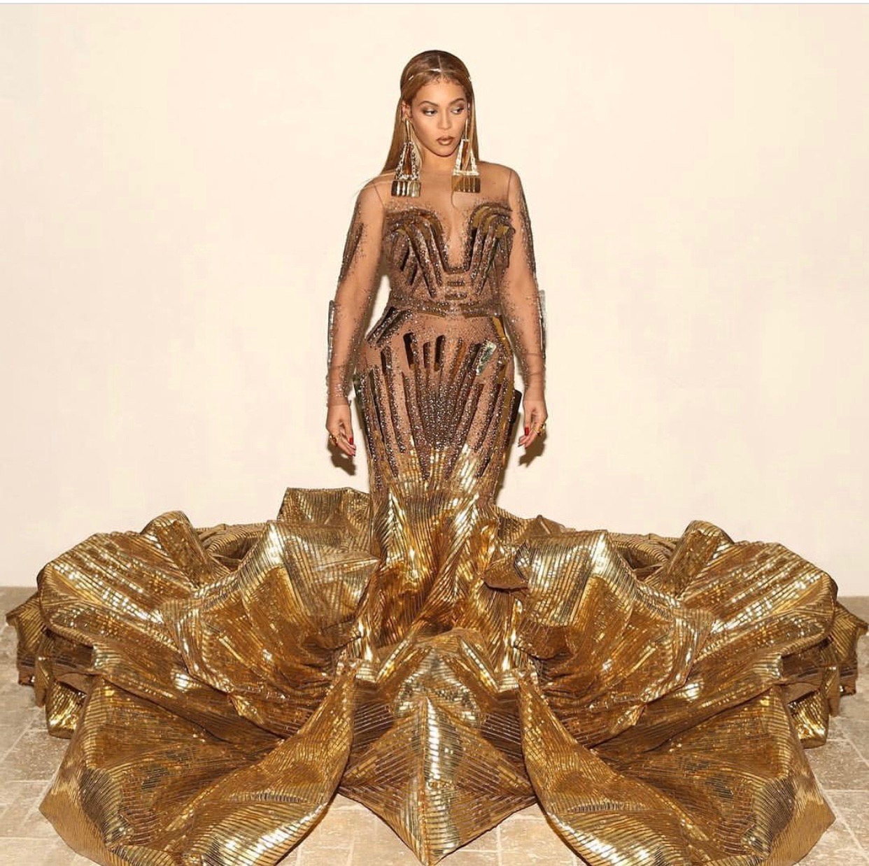 The curve-hugging gilded dress featured mesh with metallic cut outs. The train of the dress was a rumpled statement that had to be carried. “The cut-outs were strategically placed to mimic the shape of armor, as worn by the Nubian armies” designers Falguni and Shane Peacock told WWD. This embellished frock was absolutely fit for a queen.