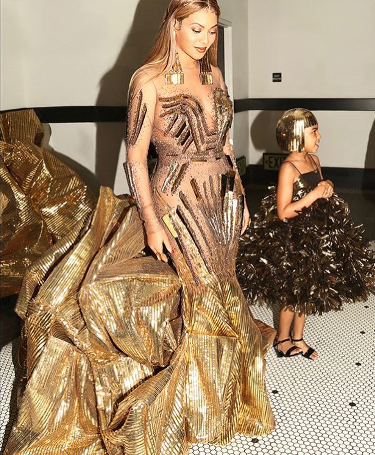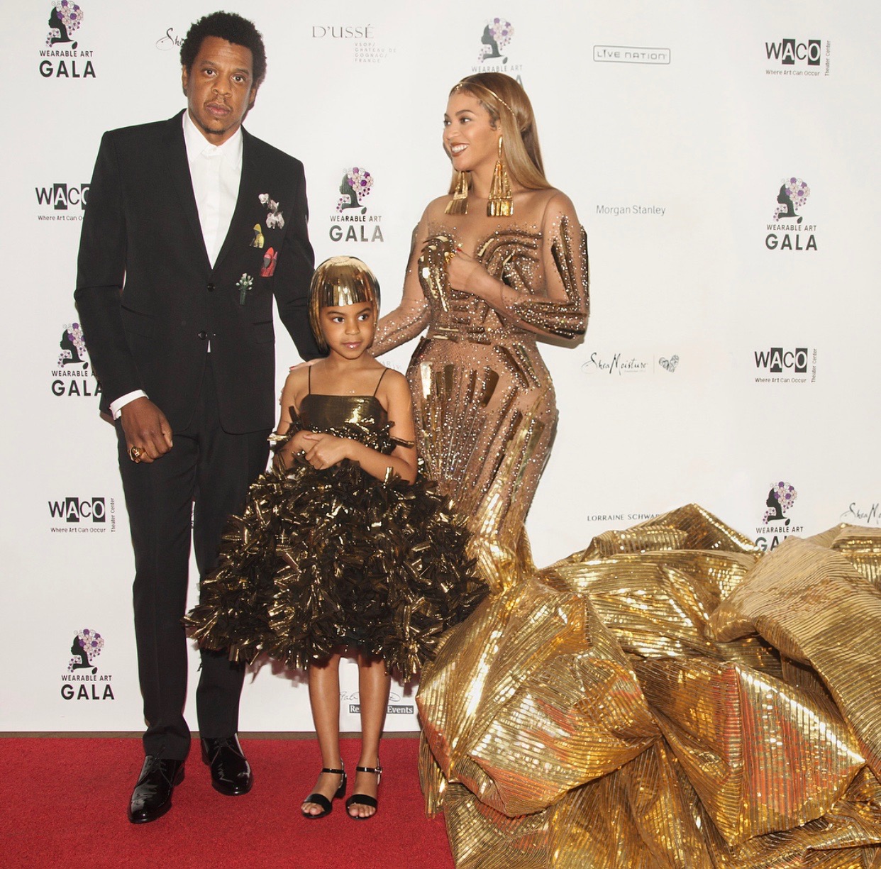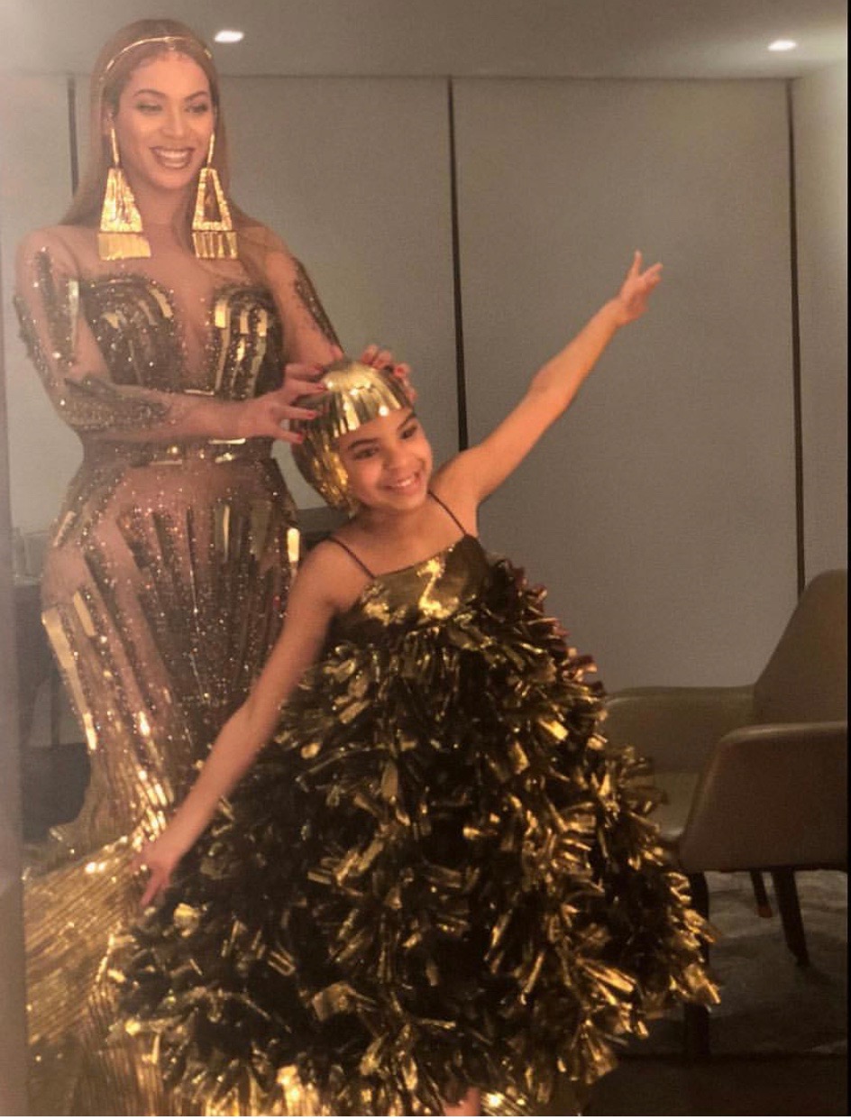 Blue Ivy accompanied her mom and dad in a very similar gold ensemble. She donned a custom Anna Kiki Couture dress that was almost identical to Beyonce’s elaborate train. This cutie teamed her dress with a custom gold headpiece by Diva MP Couture. A princess, indeed!