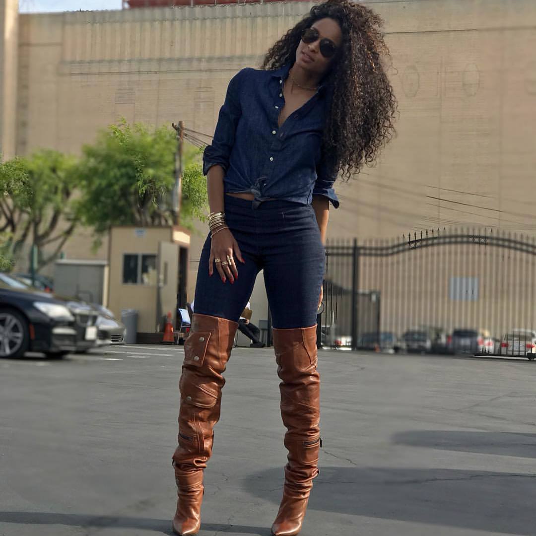 Cici also had curls galore, but she opted to wear the boots with a denim on denim ensemble. The boots worn with jeans really have a way of elongating the legs. Cute!