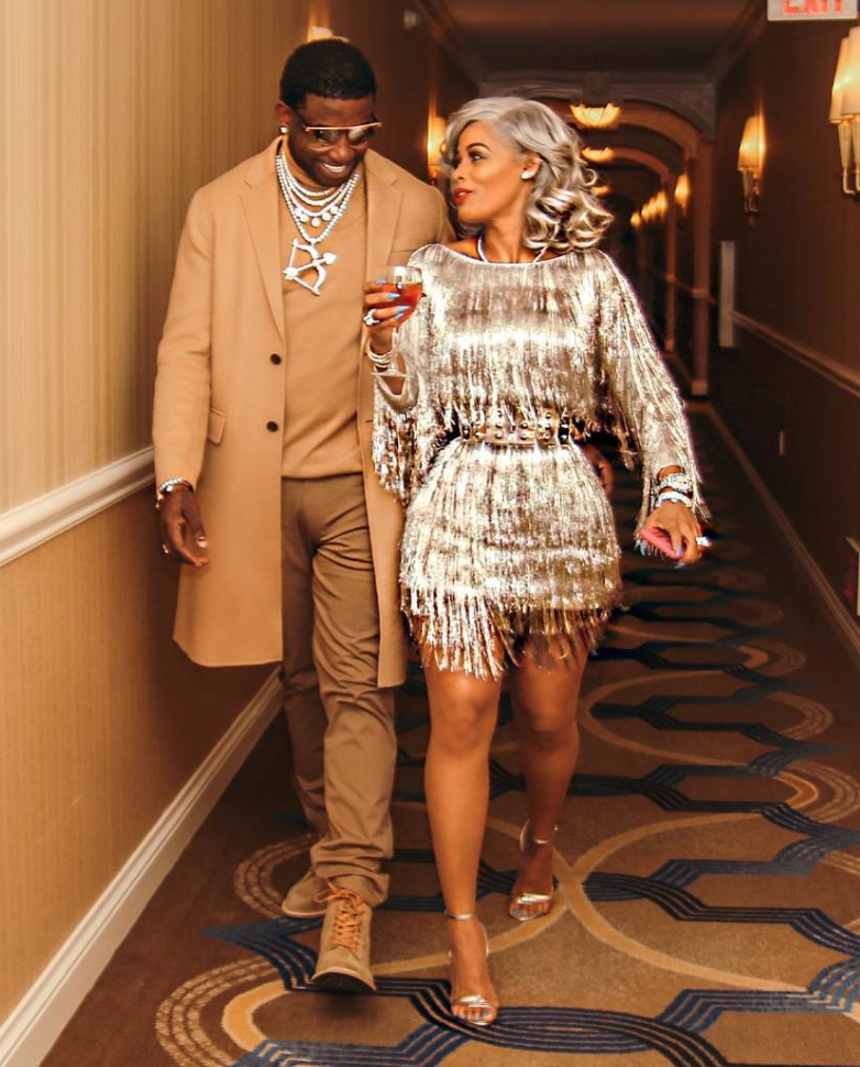 Hello Mrs. Davis! Keyshia Ka’oir stepped out with her hubby, Gucci Mane in Vegas and it’s safe to say she stole the show. Keyshia’s looks can sometimes fall flat with our readers, but you all were feeling this! She wore a Rachel Zoe metallic fringe dress and spiced it up by adding a waist belt to show off that snatched waist. From the silver hair, to the sparkly dress, and shoes — she served! If you’re feeling her look, snag a dress and add your own flair how Keyshia did.