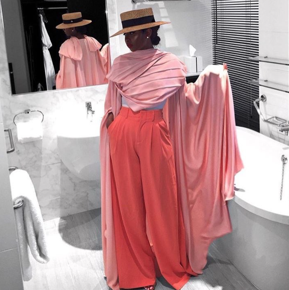 Our sister site, @FashionBombAfrica is the go-to page for amazing styles from the continent from celebs, bloggers, designers and more who deserve the recognition. This week, blogger @Seretix landed in our top 5 looks and we can see why! This bombshell was draped in a custom pink abaya and teamed it with peach wide leg Alice + Olivia pants. She topped her look off with a Gucci fedora and readers we’re loving it. @paristwotrill wrote, “This is true slayage, sheesh!” Sheesh is right! These colors look amazing together and definitely pops on Seretix’s melanin.