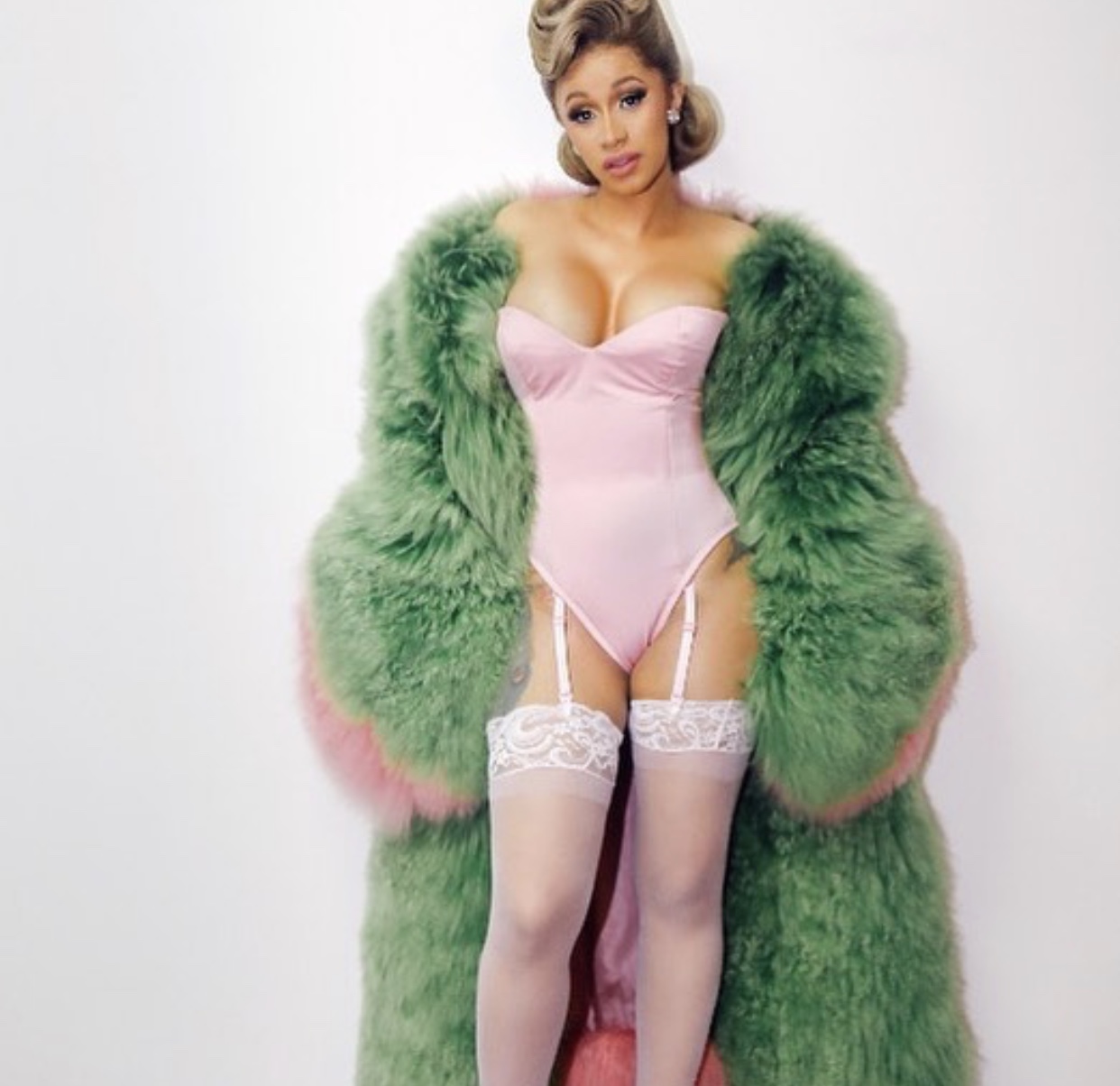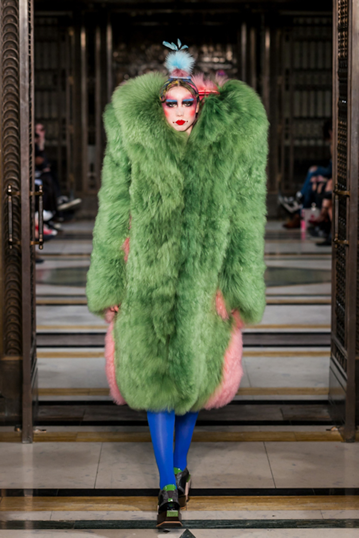 She served a sexy look, outfitted in pink lingerie with matching lace accented thigh high stockings, topped off with an amazingly luxurious green and pink mid length Mongolian Lamb Coat from David Ferreira.