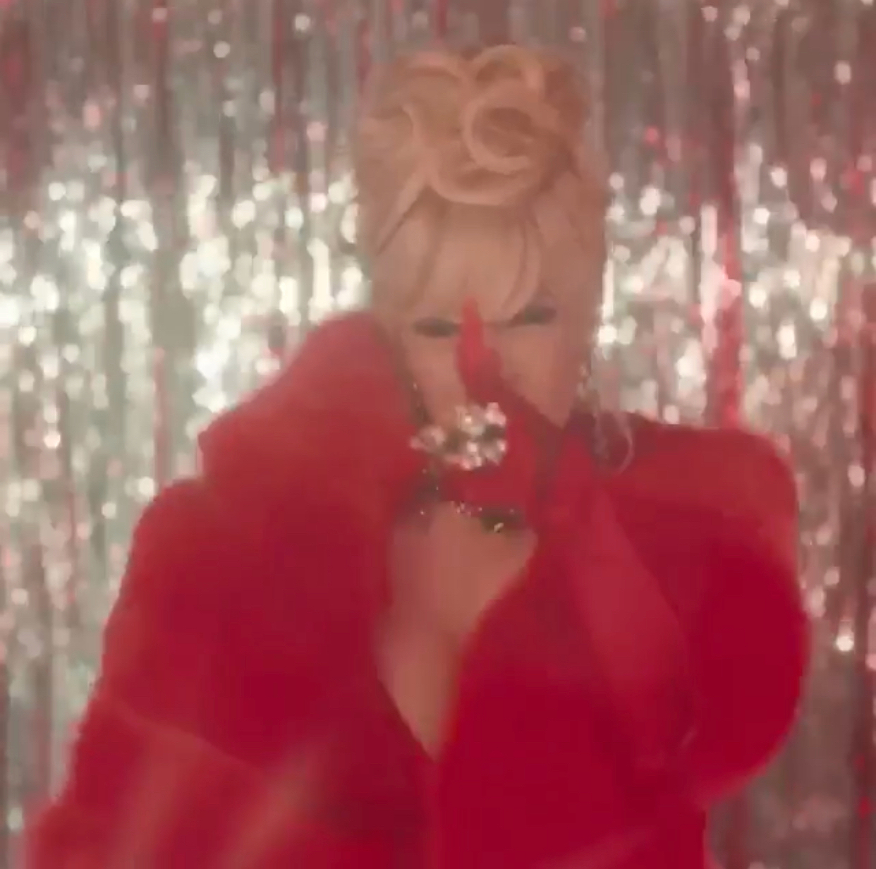 She donned this standout Fall/Winter 2018 Mark Fast White Sequined Ostrich Feather Fishnet Detail dress and a pair of sequined gloves. It’s all luxe indeed!