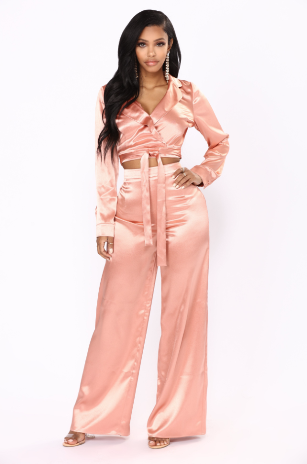 The pant set includes a long sleeve crop top that shows off some skin, but keeps the look classy. The high waist trousers accentuate curves and is sure to have you looking snatched. You can even tailor the wide leg pants to your liking as Reginae did. Cute! Eager to try your hand at the trend? Purchase the set for only $50 here.