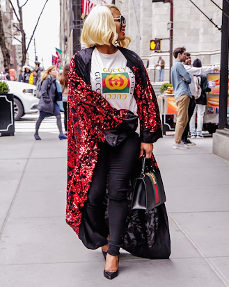 Keep it fly & flashy as our E.I.C Claire Sulmers did wearing sleek black jeans, a fun graphic tee paired with chic black pumps for a fabulous day or nighttime look.
