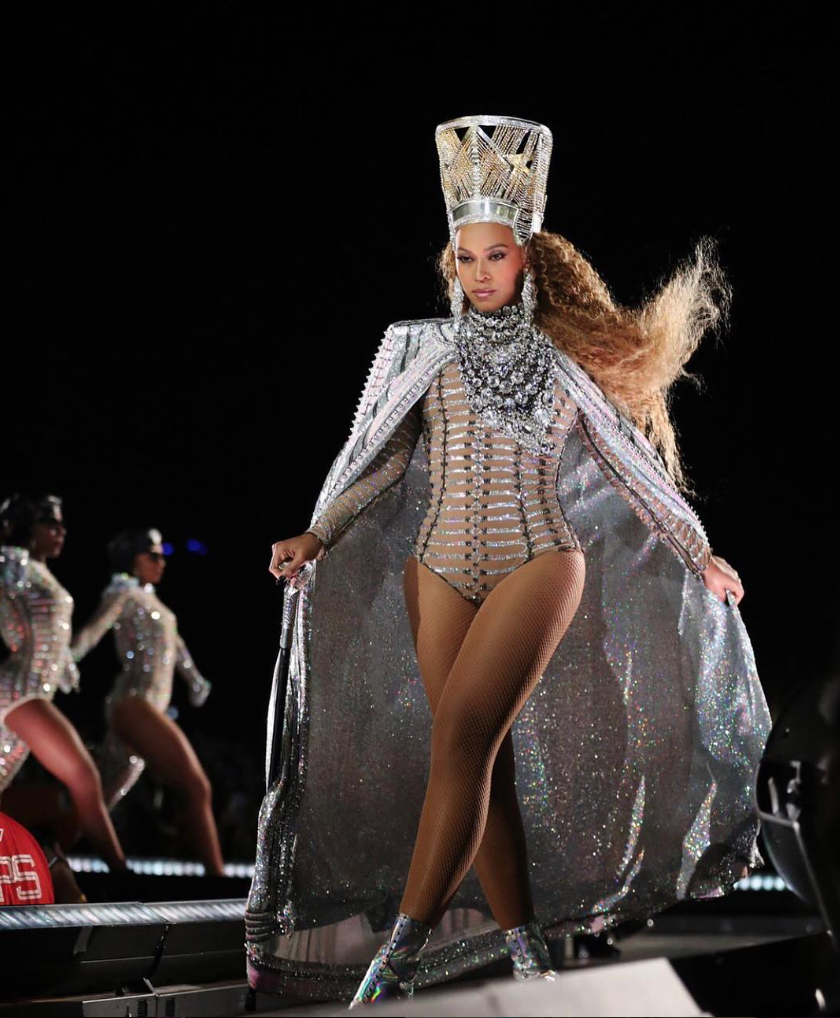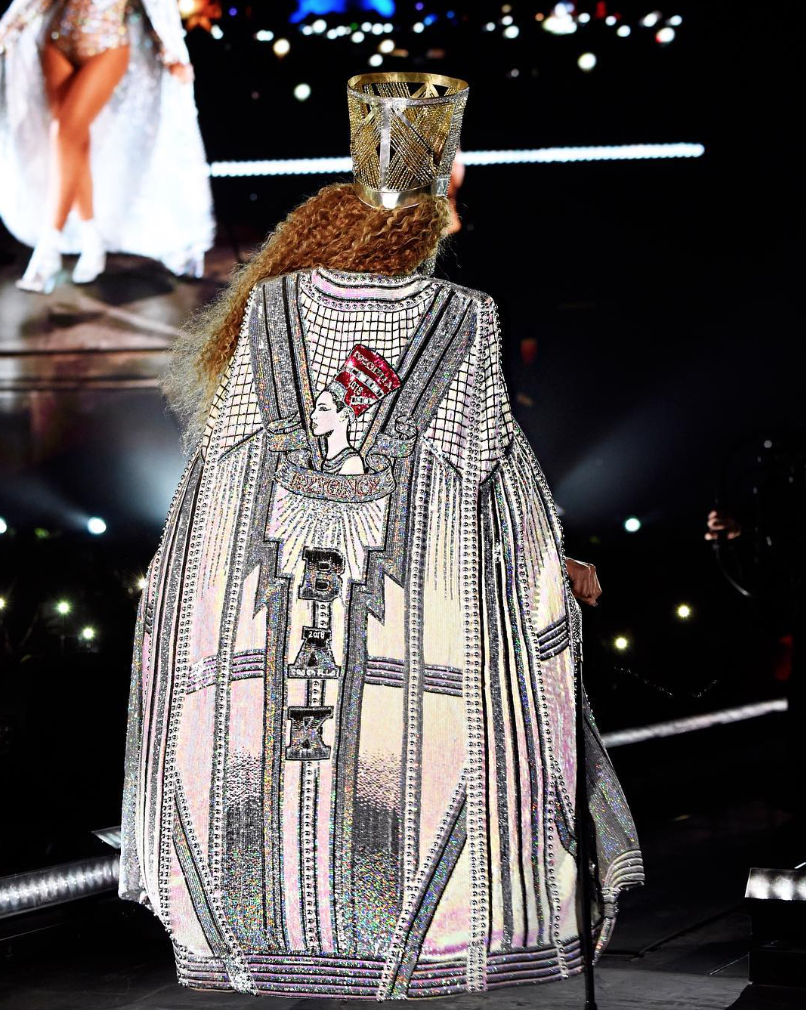 Similar to the first weekend, Bey looked regal in an Egyptian royalty inspired look. This time she opted for a silver look as oppose to the gold and black beaded ensemble from last week. The back of her cape was bejeweled with BΔK and an Egytpian bust. She completed her look with a Nefertiti-inspired crown. Yes, Queen Bey!
