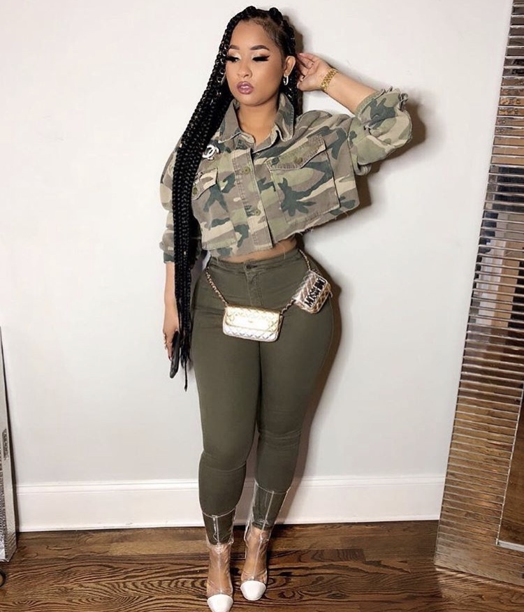 Tammy effortlessly matched her olive colored jeans with a Top Shop army cropped jacket, a Moschino chain, purse belt, and clear Chanel booties.