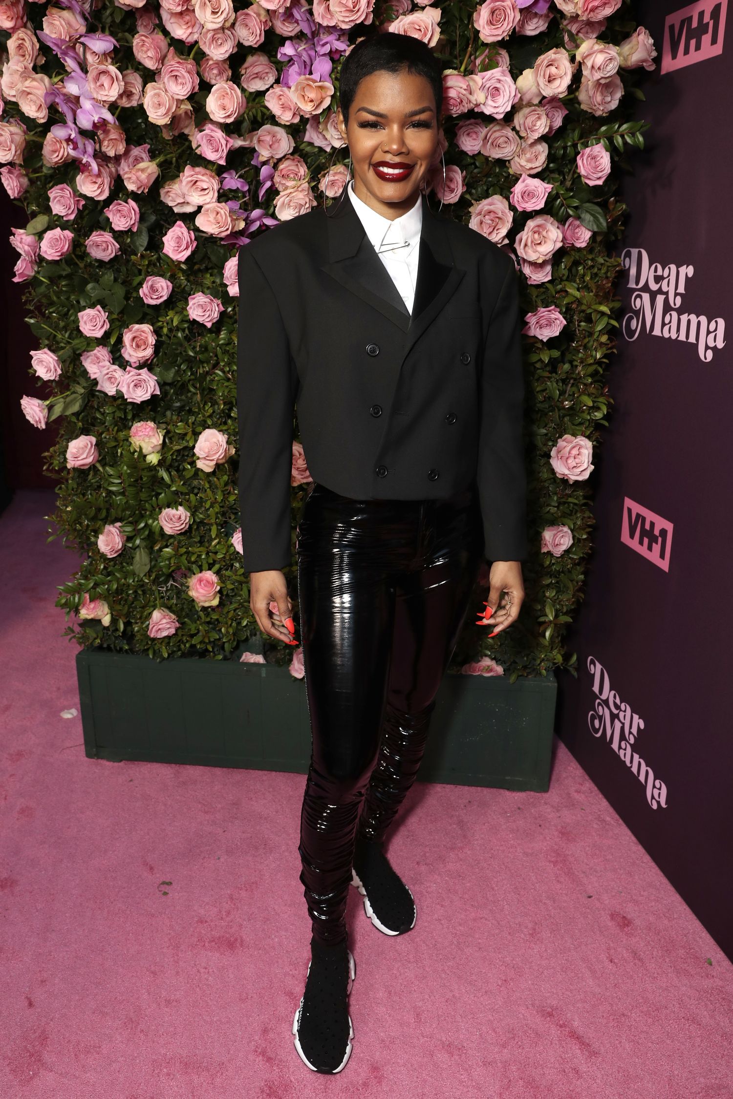 Teyana Taylor kept it comfortable, yet chic in a cropped tuxedo jacket, patent leather pants, and Balenciaga trainer sneakers. She wore a bold red lip to add a pop to the black and white look.