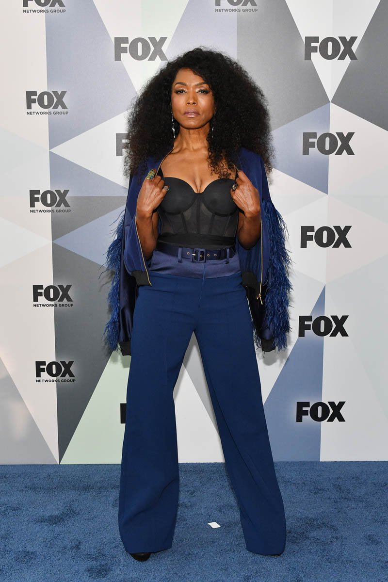 Angela gets it right every single time! This ageless beauty stunned at Fox’s Upfronts in NYC wearing a pants suit by Viktor Zerbinato. But, it’s not your normal pantsuit—the wide leg pants had a matching bomber-like jacket with feathery sleeves that hung off her shoulder. She teamed the chic ensemble with a black bustier and showed off a hint of cleavage. Hot!