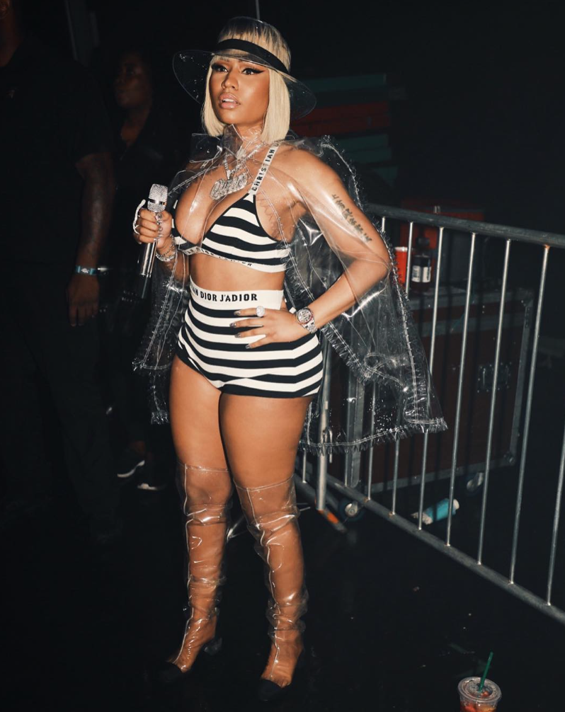 Rainy festival? No problem! Nicki Minaj made a surprise appearance at the Rolling Loud festival prepared for the rainy set. She hit the stage wearing a Chanel SS18 transparent poncho paired with matching see-through thigh-highs by the brand and a visor. Under her poncho she rocked a Christian Dior SS18 striped shorts set. Nicki is the queen of owning a look that we wouldn’t traditionally see together, and she absolutely owned this!