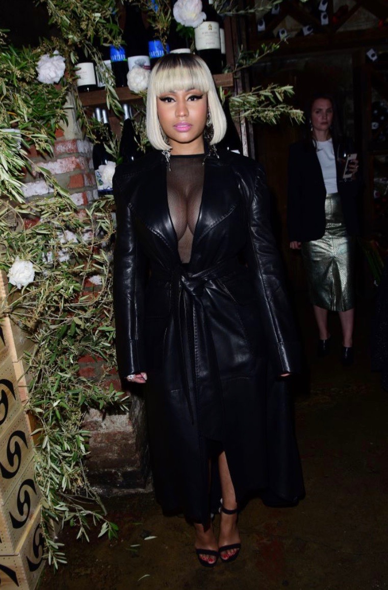 While she was inside the dinner, the ‘Chun-Li’ rapper covered up her dress with a Norisol Ferrari leather trench coat. Nicki certainly knows how to take an all black look and make it hot! Are you feeling her new banged bob hairdo she rocked with the outfit?