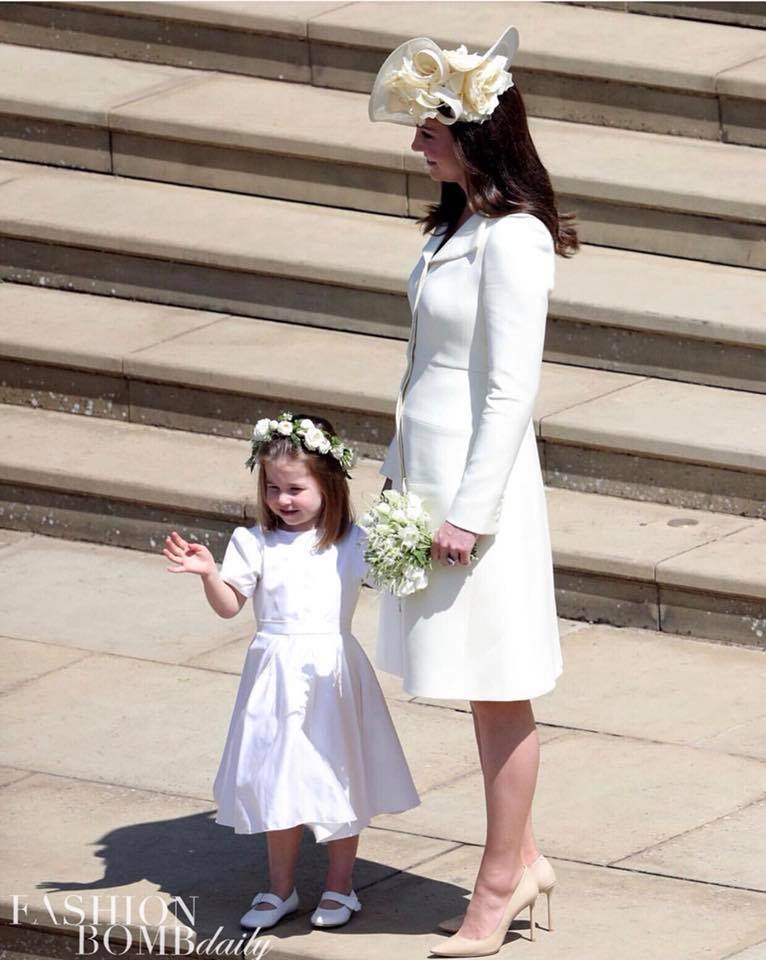 Duchess of Cambridge, Kate Middleton and also sister-in-law to the groom wore an off white Alexander McQueen coat dress teamed with a floral designed hat. Her adorable mini-me, Princess Charlotte also wore a white dress and accessorized with a blossoming halo headpiece.